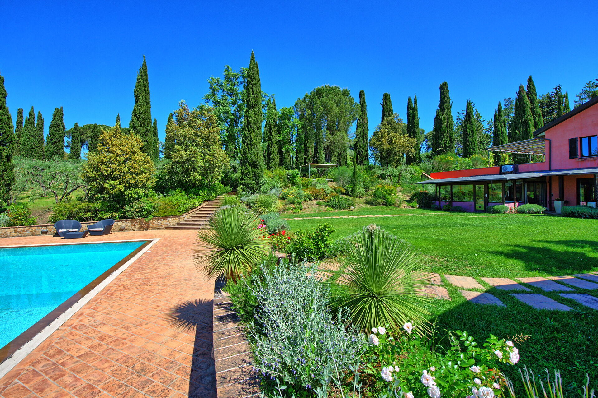 Den fantastiska Villa Barbarella är elegant inredd och har en vacker trädgård full av växter och blommor. Det stora, välutrustade utomhusområdet erbjuder gott om utrymme för att koppla av och umgås med vänner och familj.