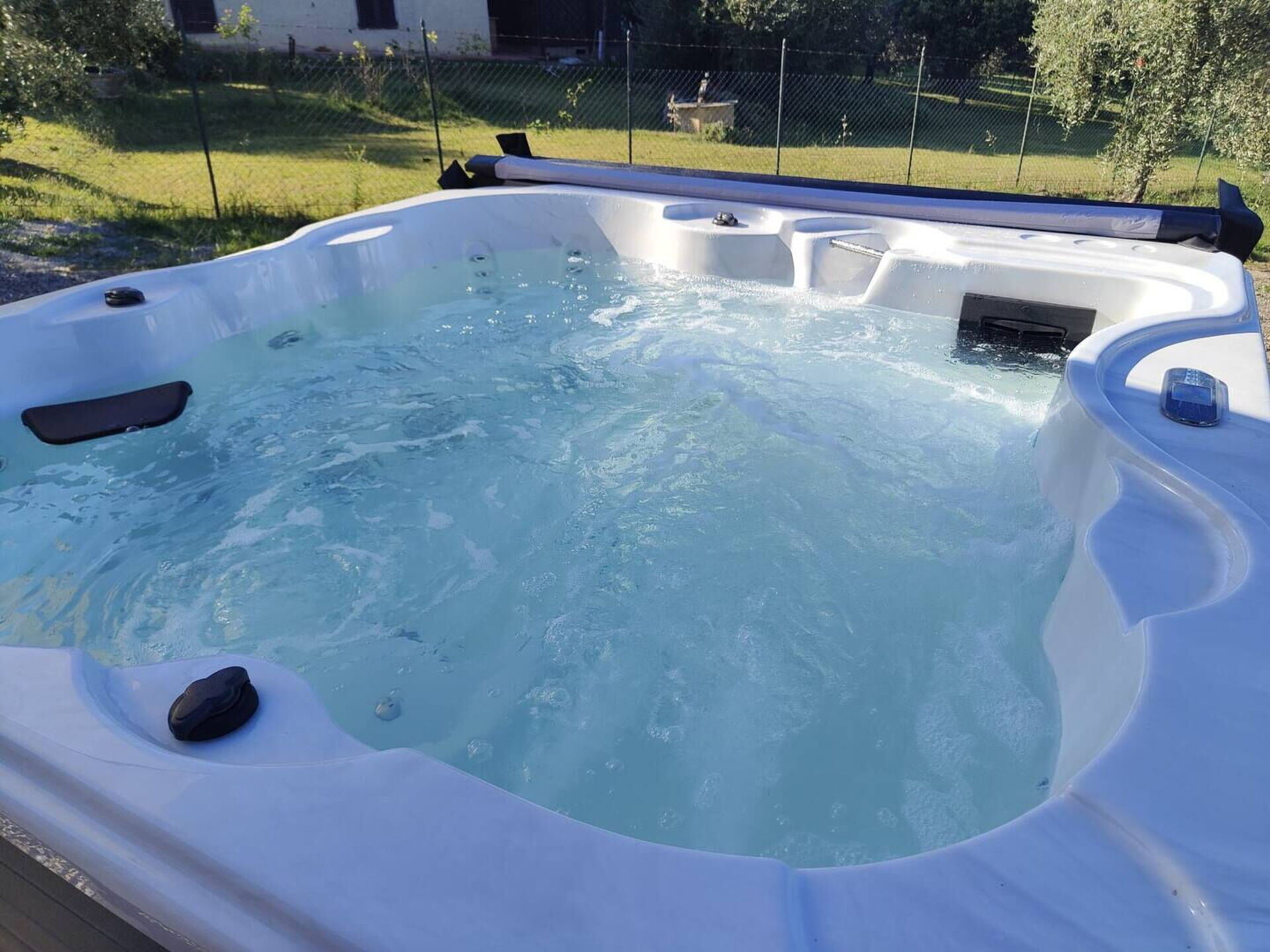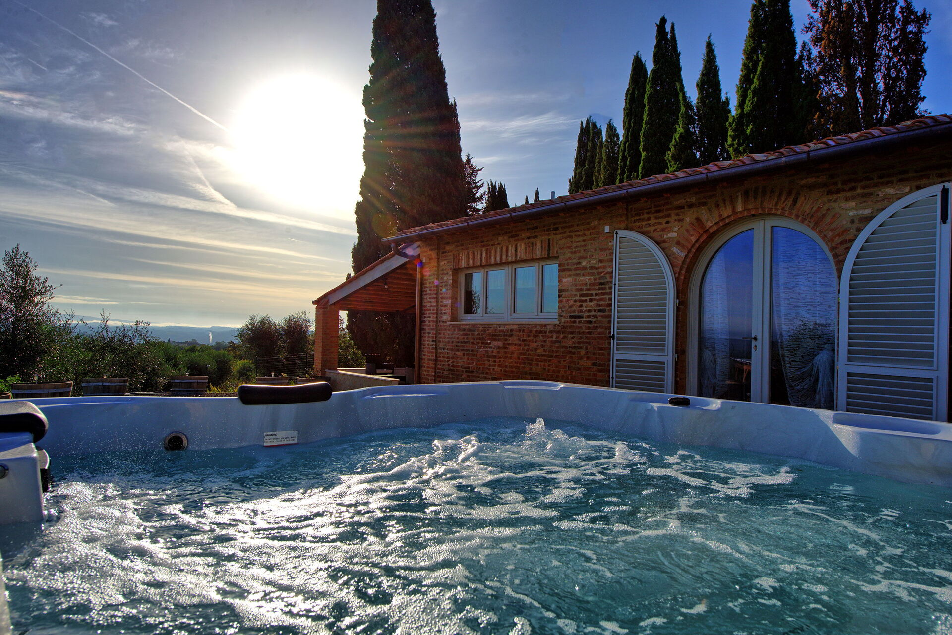 En bubbelpool står till gästernas förfogande och ligger framför huset med utsikt över landskapet.
