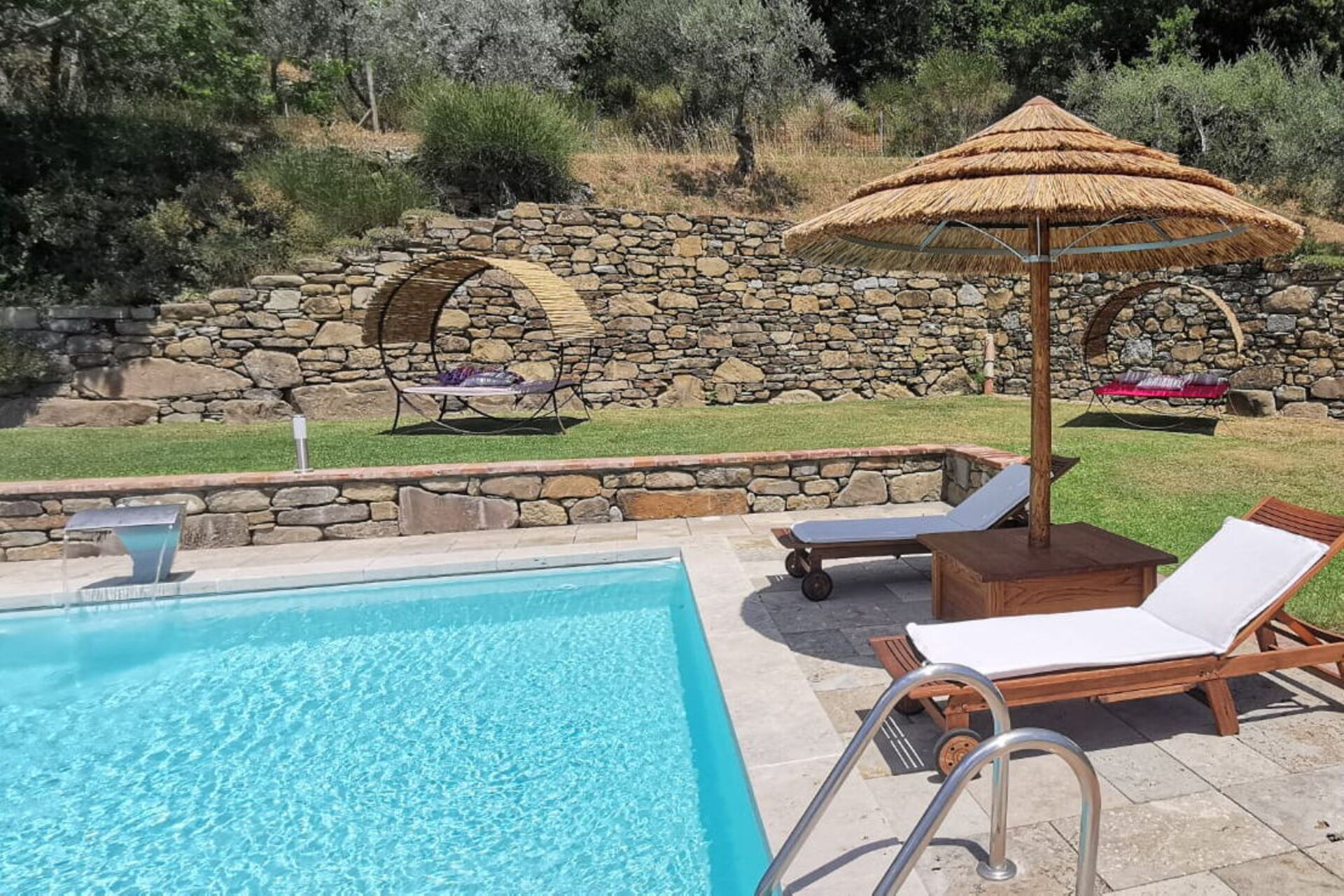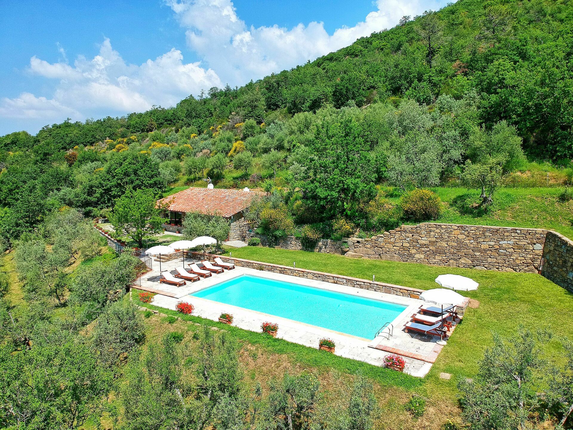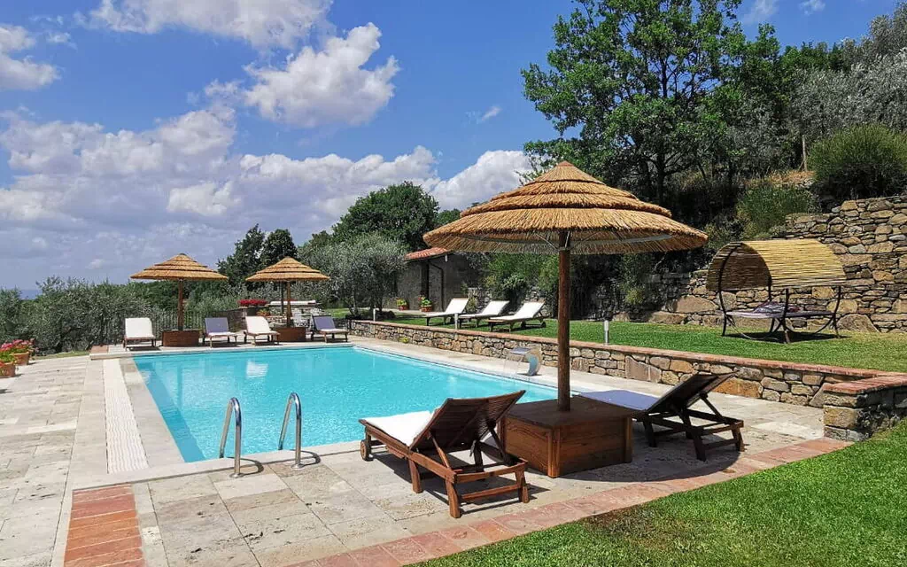 Vackert hus med privat pool i Toscana, en bit bort från staden Castiglione Fiorentino. Semesterhuset ligger på en kulle med fantastisk utsikt över den omgivande landsbygden och slottet Montecchio. På uteområden kan du njuta av användningen av en stor välskött trädgård med trädgårdsmöblar idealisk för utomhus måltider och en trevlig privat pool med panoramautsikt som ligger på en nivå ovanför villan. Huset har totalrenoverats och omvandlats till ett charmigt hus med en smakfull inredning.