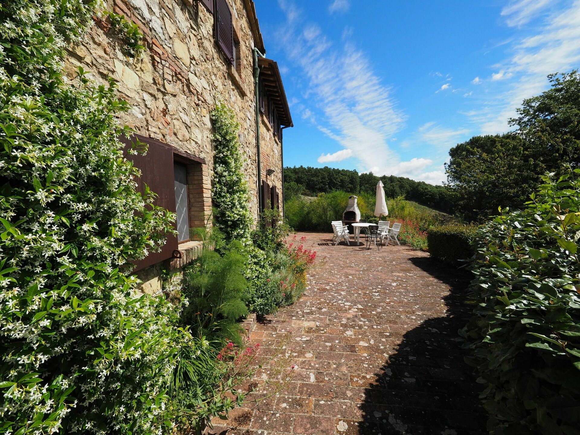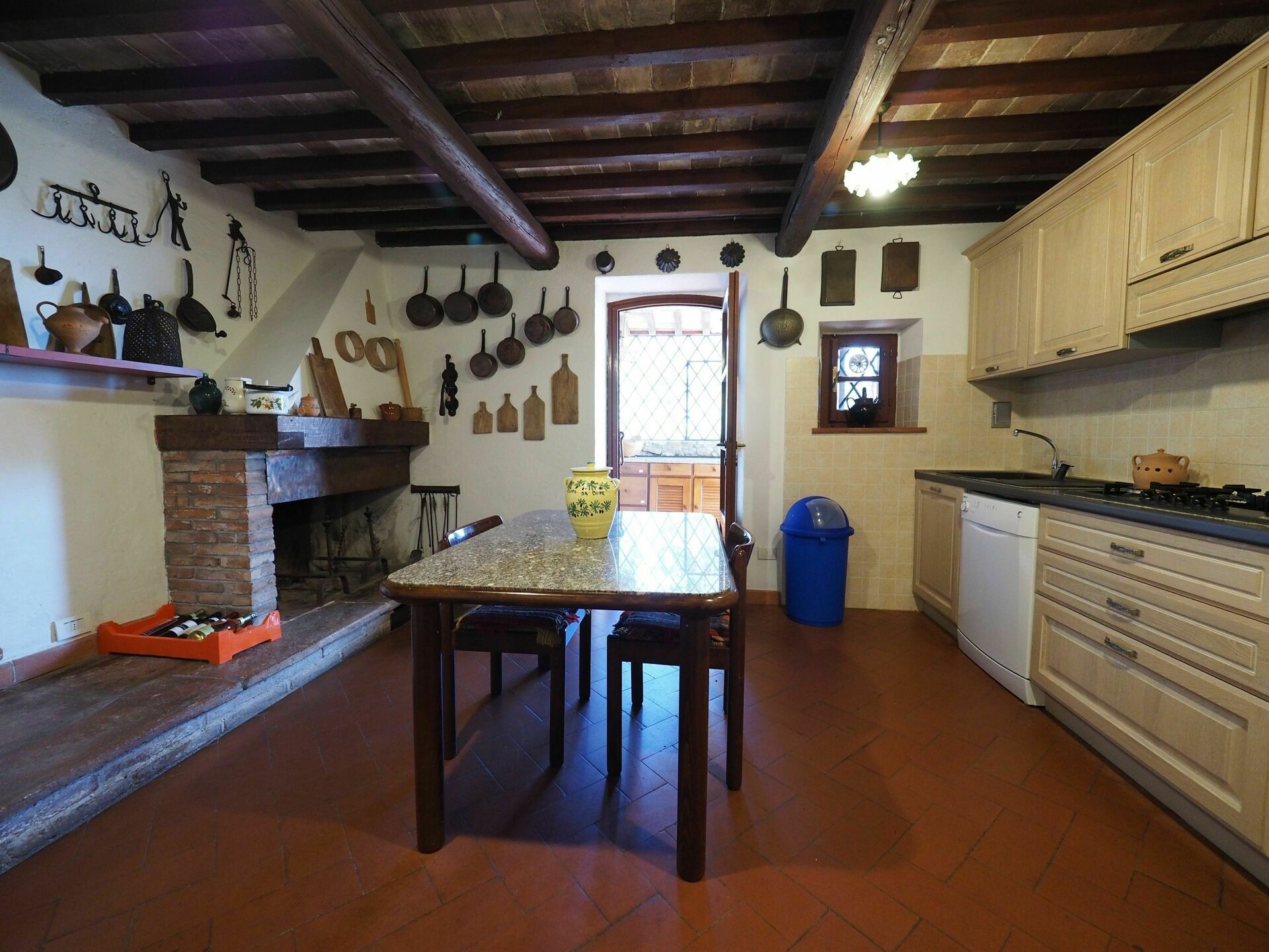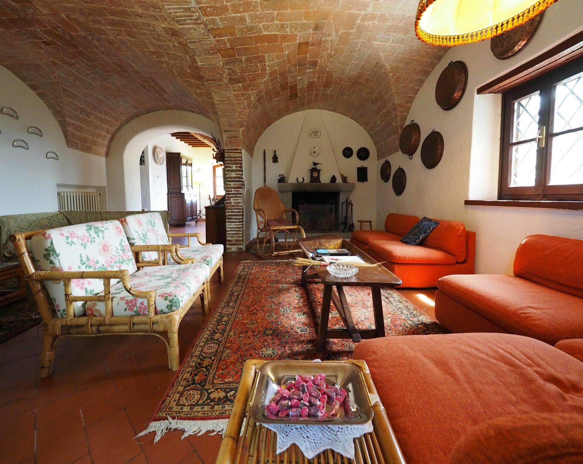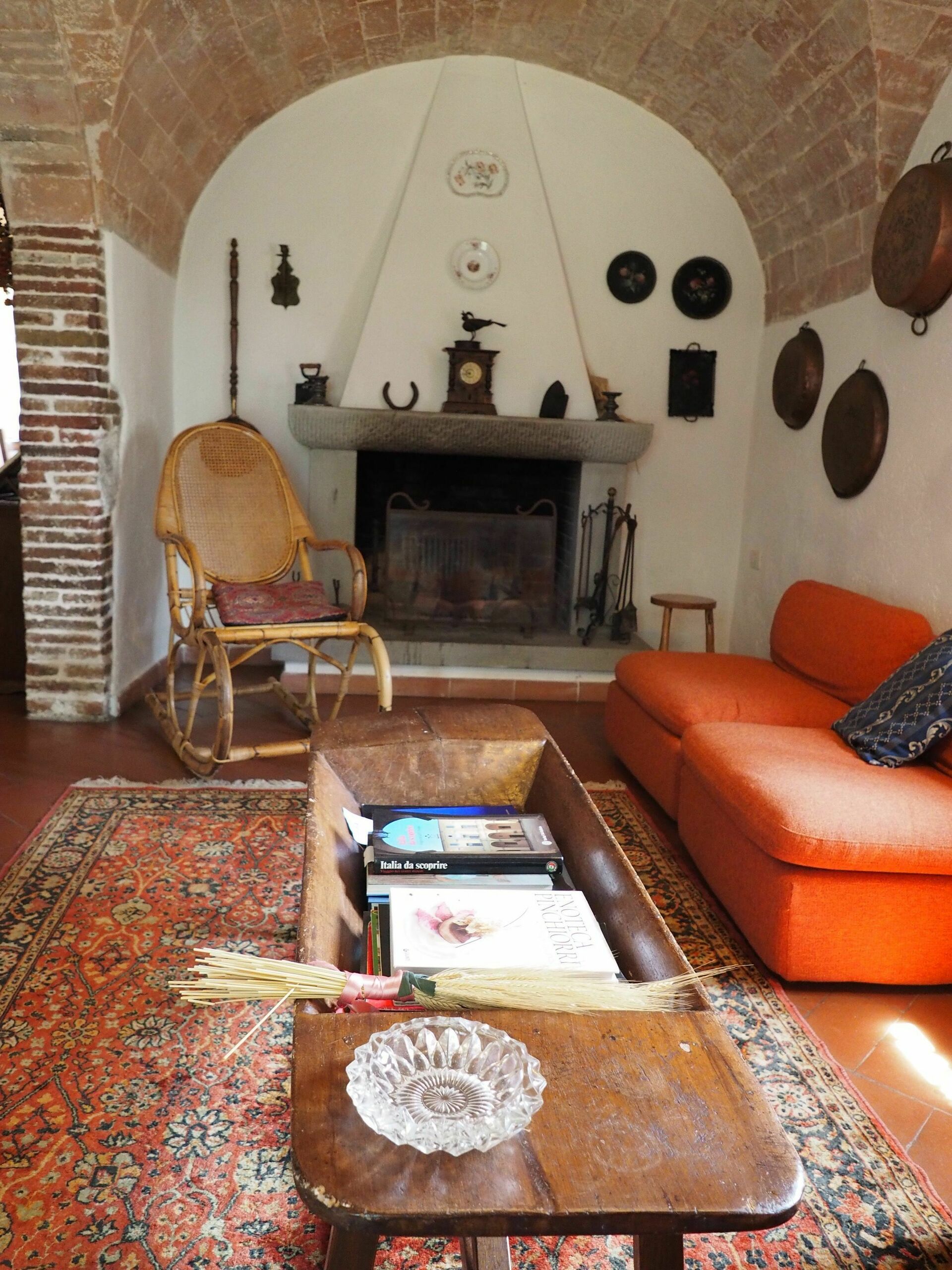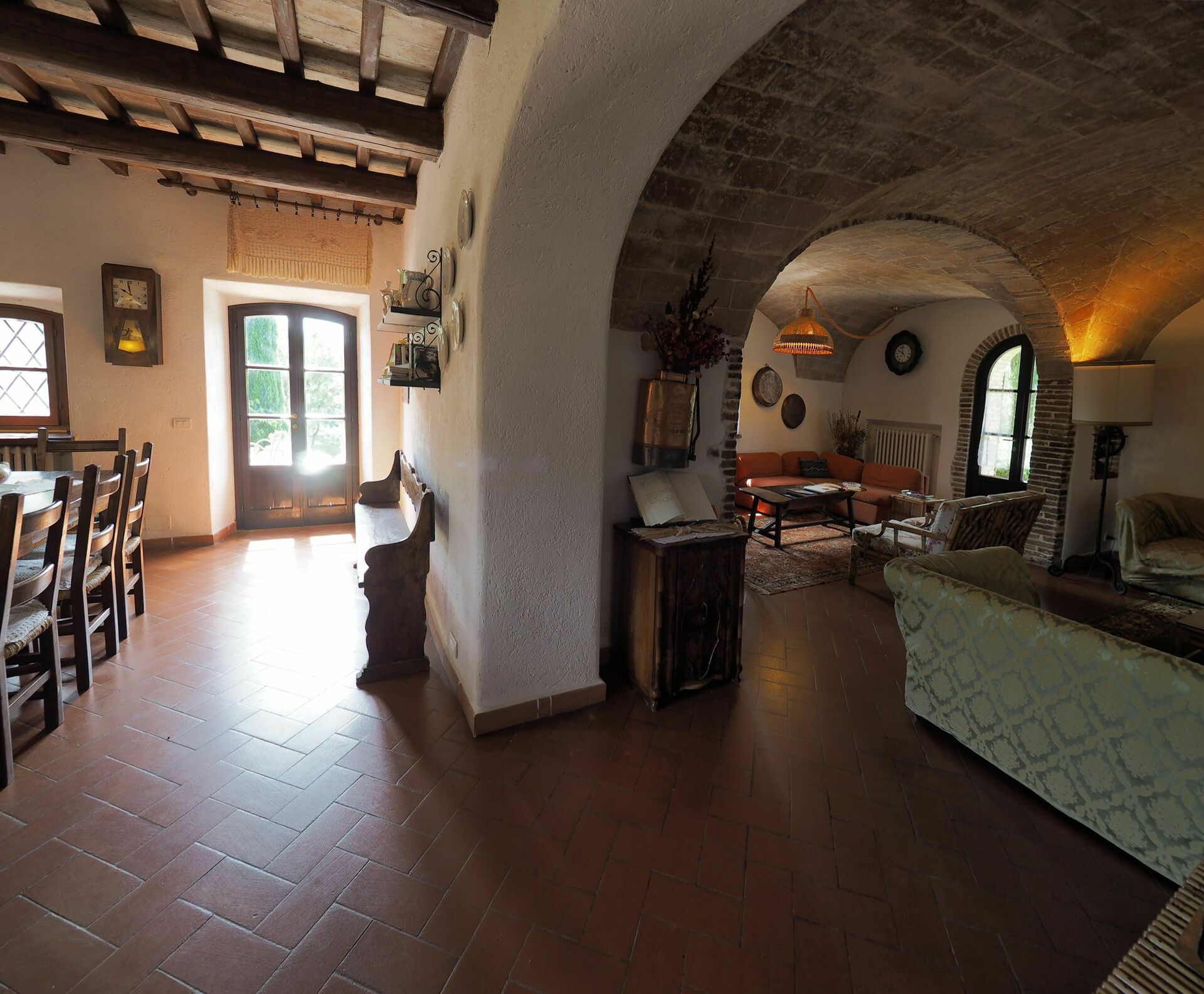 Stort vardagsrum med soffor, trevlig matsal, tillgång (via 3 trappsteg) till ett stort, välutrustat kök (ugn, frys, diskmaskin, brödrost, kaffebryggare) med stor öppen spis perfekt för grillning, veranda används som förvaring som leder till en stor möblerad terrass. 2 steg högre: toalett