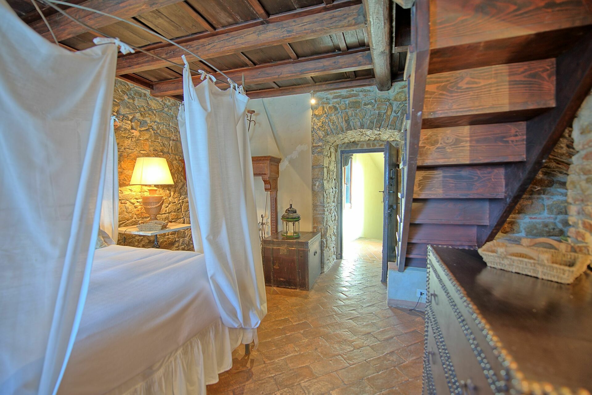 Första våningen: sovrum med öppen spis och tillgång dubbel, via en trätrappa till ett rum med ett litet badrum med dusch, garderob och tillgång till en liten terrass.