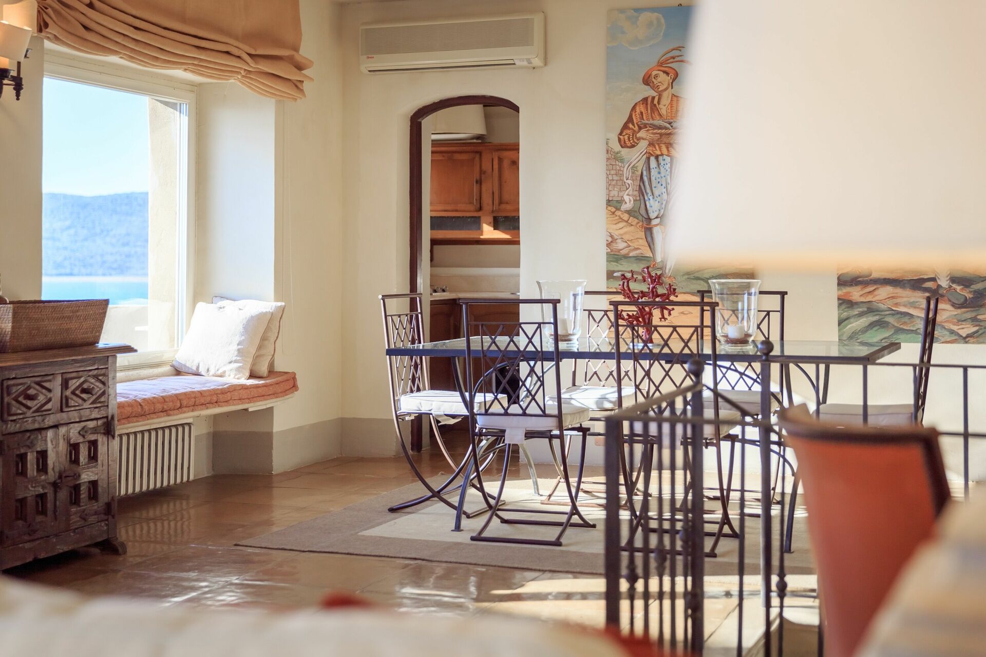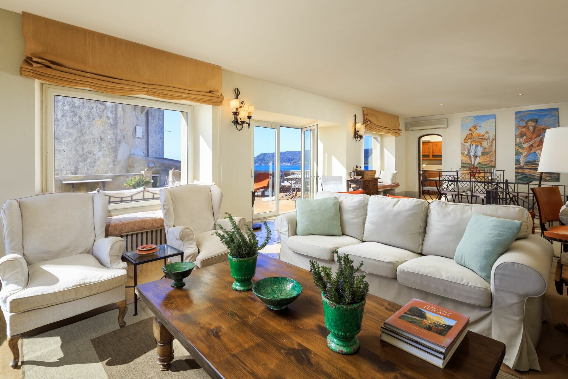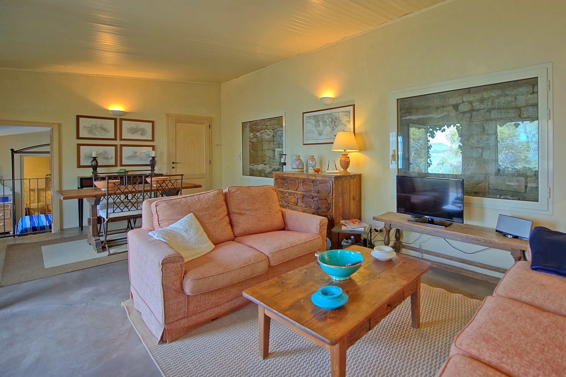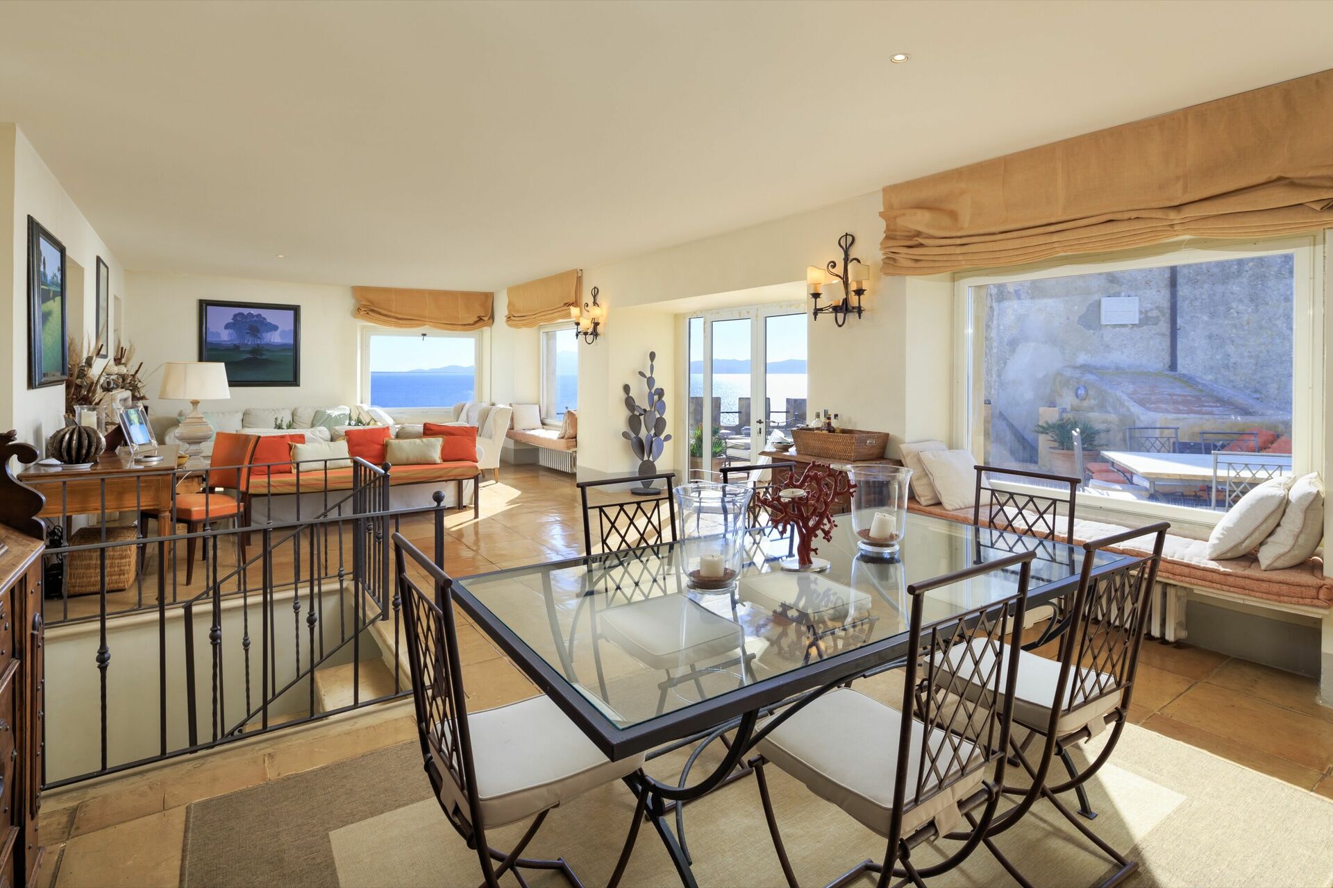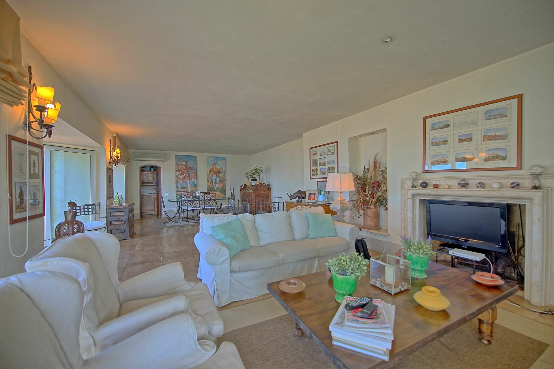 Första våningen: stort och ljust vardagsrum med öppen spis ger luftkonditionering, matplats med underbar utsikt över kusten och tillgång till en vacker möblerad terrass. Detta område av villan har luftkonditionering.