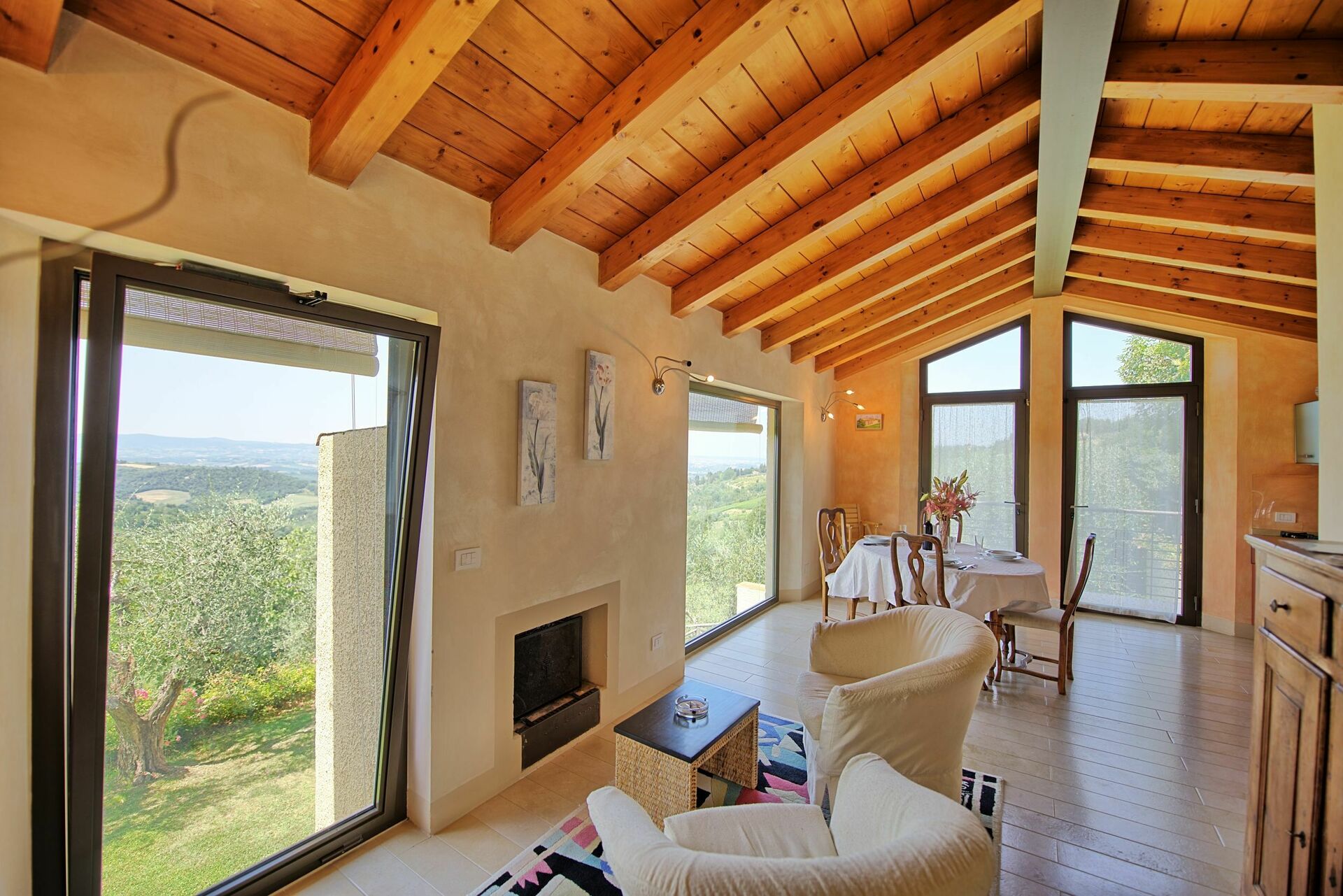 The villa has an open plan living area with the most spectacular view over the family vineyard and valley looking towards San Gimignano. The air conditioning upstairs was very welcome while the bedrooms downstairs remained lovely and cool. The swimming pool is wonderful.