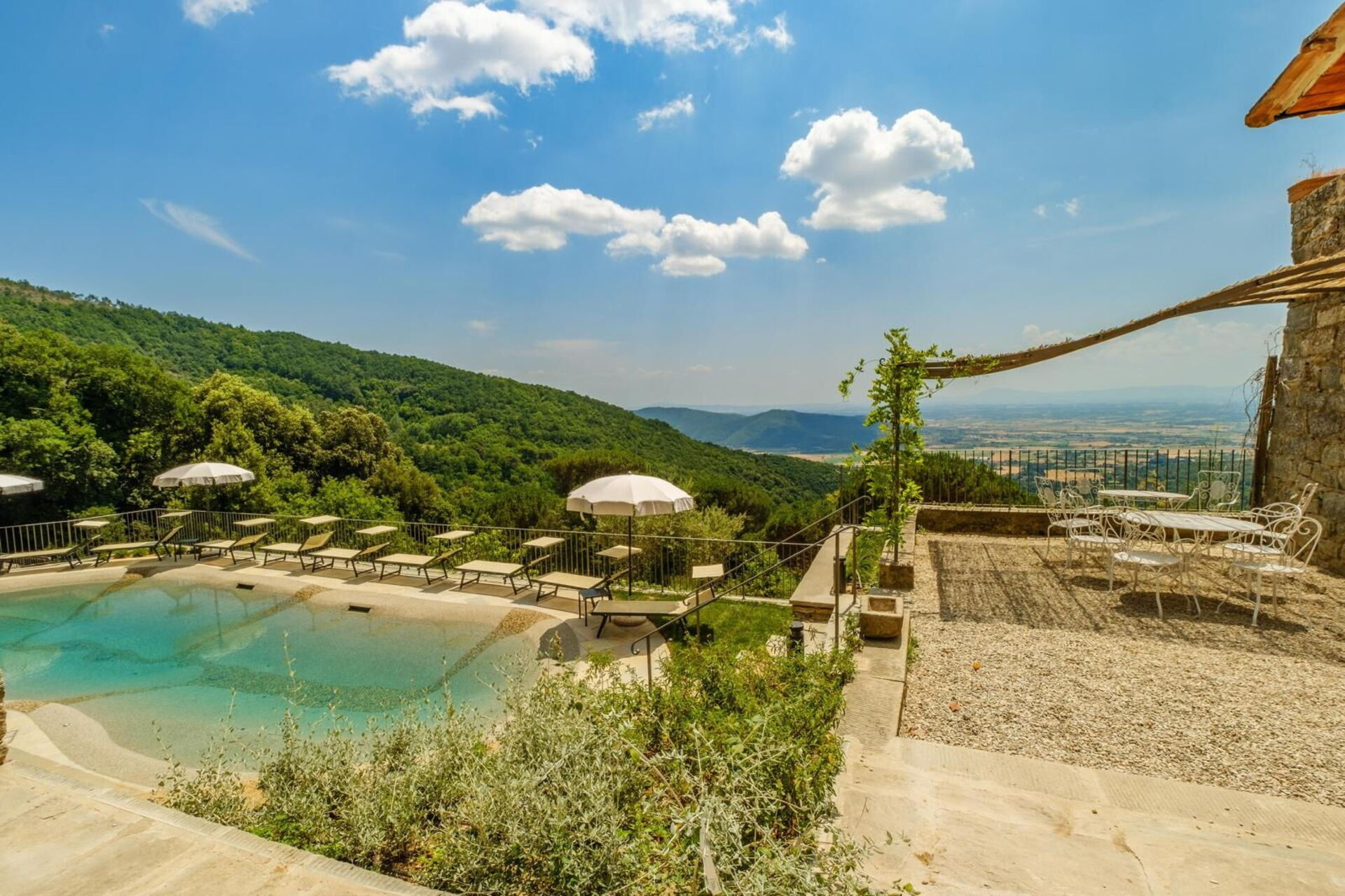 Historisk herrgård vackert restaurerad för semesteruthyrning nära Cortona, en karakteristisk by i Toscana. Villa Laparelli Pitti ligger i ett lugnt och panoramiskt läge på sluttningen av en kulle som sluttar ner mot dalen och erbjuder en förtrollande utsikt över Val di Chiana, som kan njutas särskilt vid solnedgången både från den vackra privata poolen och från de stora terrasserna. Utomhus är villan omgiven av ett unikt och oförglömligt landskap. Den stora och välskötta trädgården som omger villan rymmer den vackra privata poolen med hydromassagehörna; denna panoramapool är också idealisk för barn tack vare en grund del och en praktisk tillgång med strandeffekt. Denna fantastiska villa kommer att ge sina gäster en oförglömlig upplevelse av avkoppling nedsänkt i historien och skönheten i det toskanska landskapet. Villa Laparelli Pitti är elegant, raffinerad, inredd med vackra antikviteter och utrustad med alla moderna bekvämligheter. Fastigheten erbjuder 5 sovrum, vart och ett med privat badrum, och kan bekvämt rymma upp till 10 personer. Villa Laparelli Pittis strategiska läge gör det möjligt för gäster att utforska både Toscana och närliggande Umbrien: Besök Siena, Arezzo, Perugia, Assisi, Gubbio samt Chianti Classico, Trasimenosjön och Val d'Orcia.
