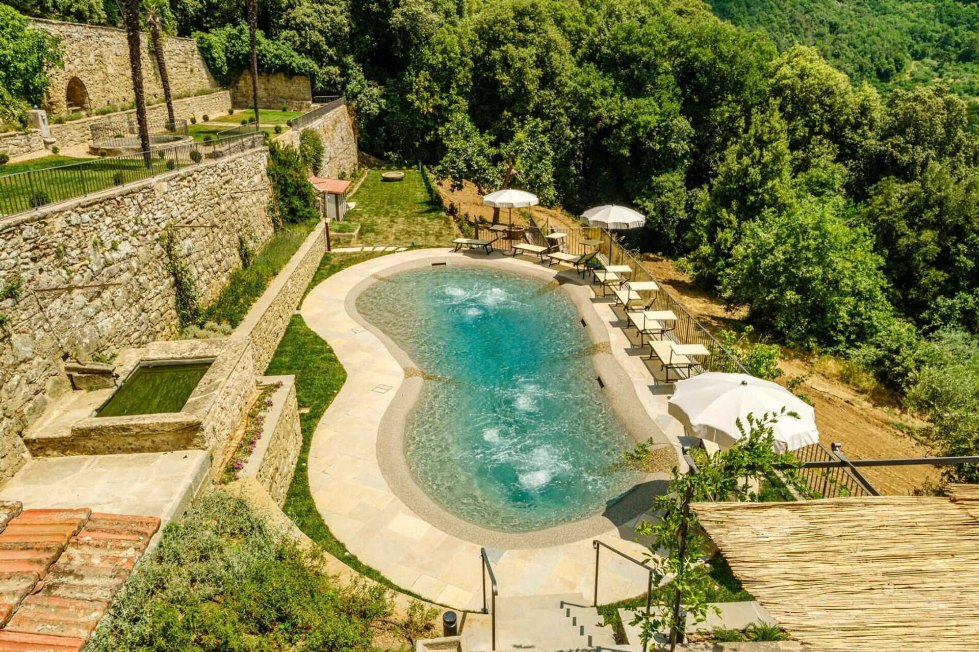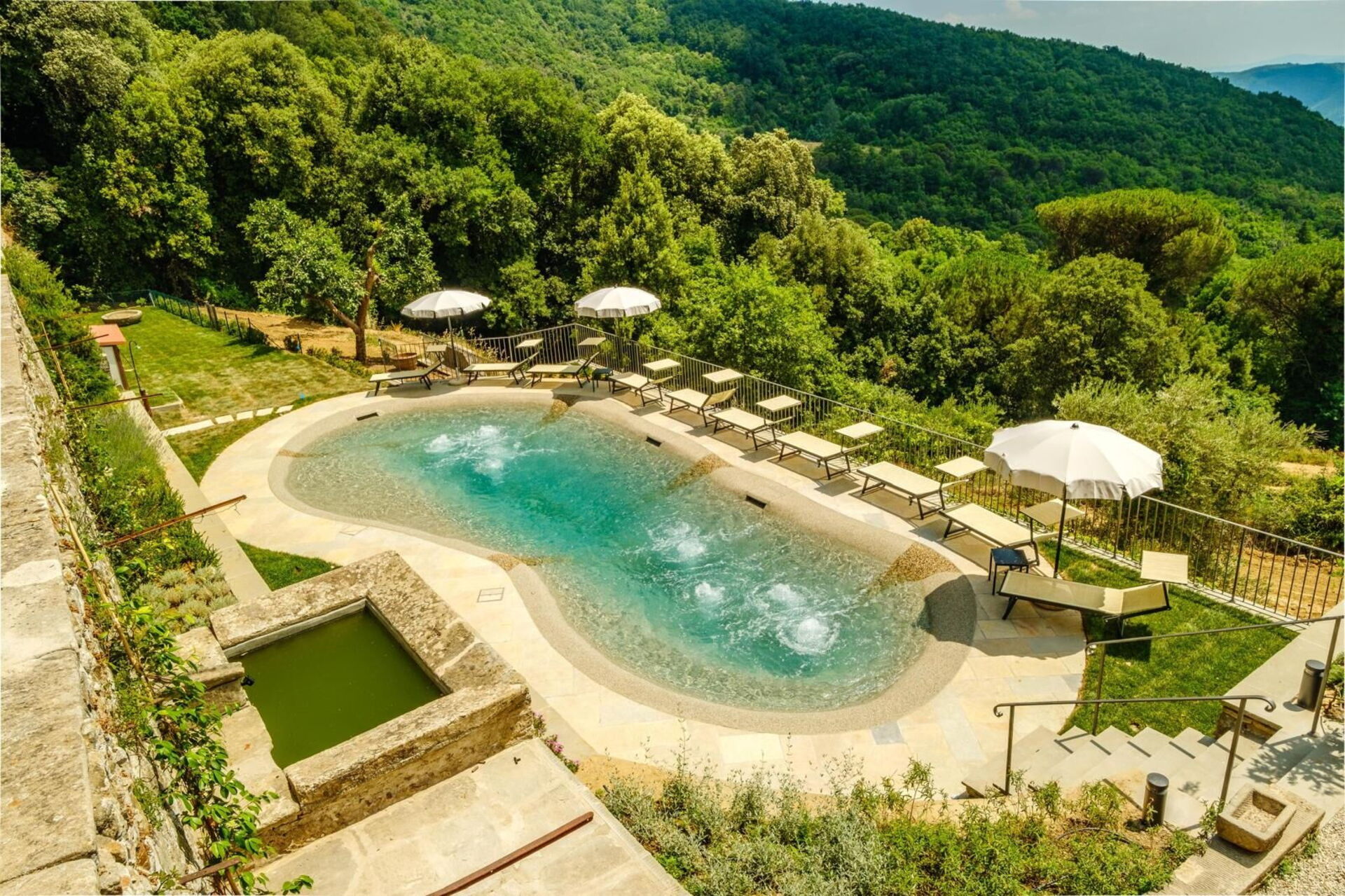 - Oregelbundet formad pool reserverad för gästernas exklusiva bruk med hydromassage-strålar (72 m2; max djup 1,40m)