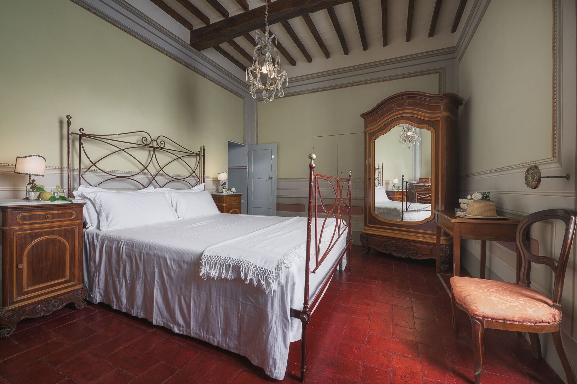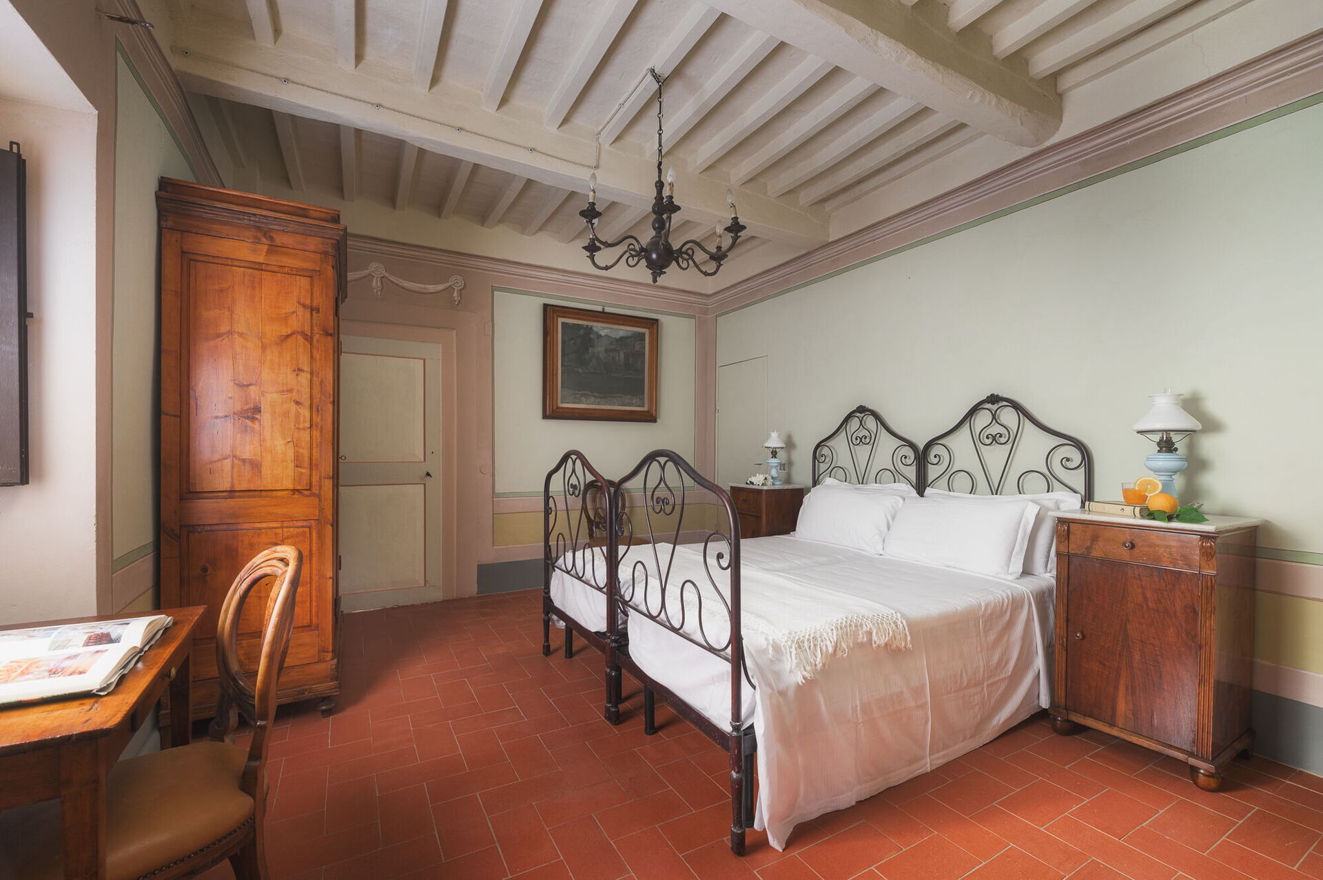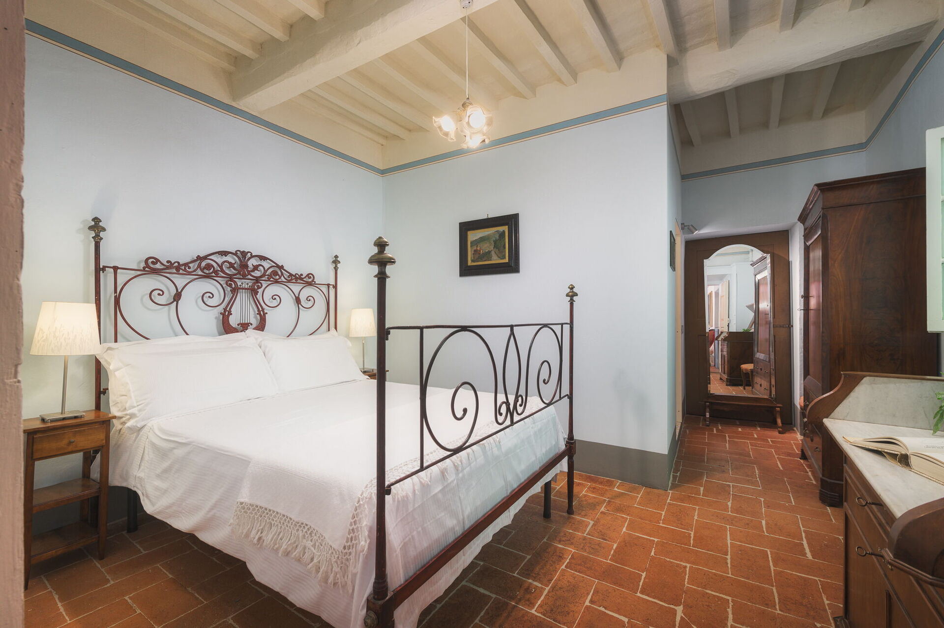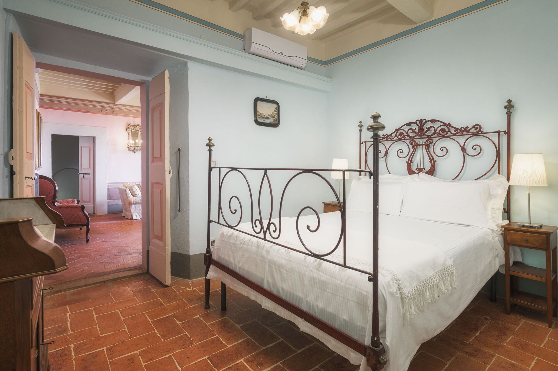 Andra våningen: svit med ett litet vardagsrum, dubbelrum och privat badrum med dusch; dubbelrum, sovrum med fransk säng. De två sovrummen delar badrum (med ingång från båda rummen).