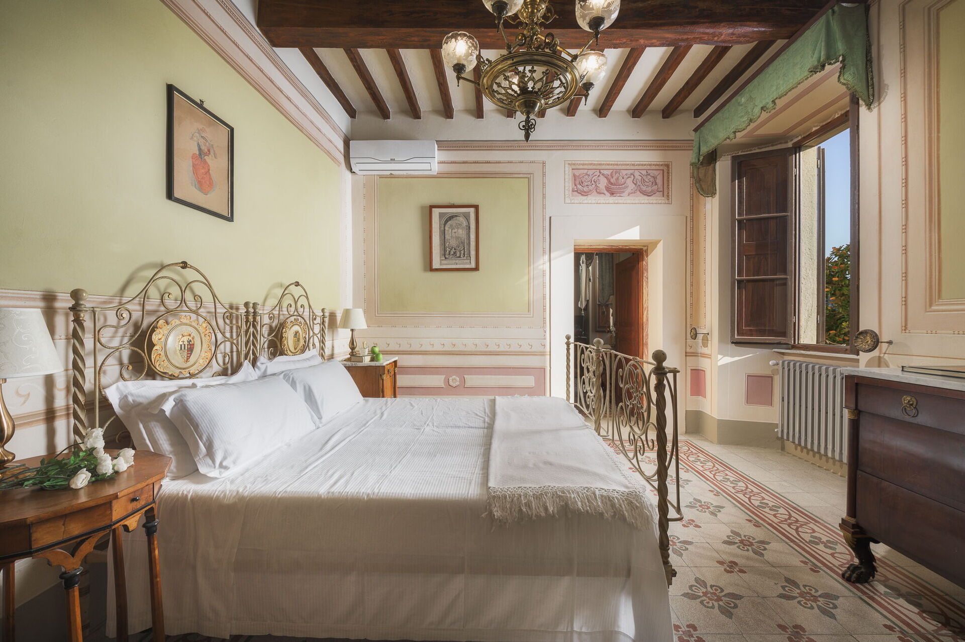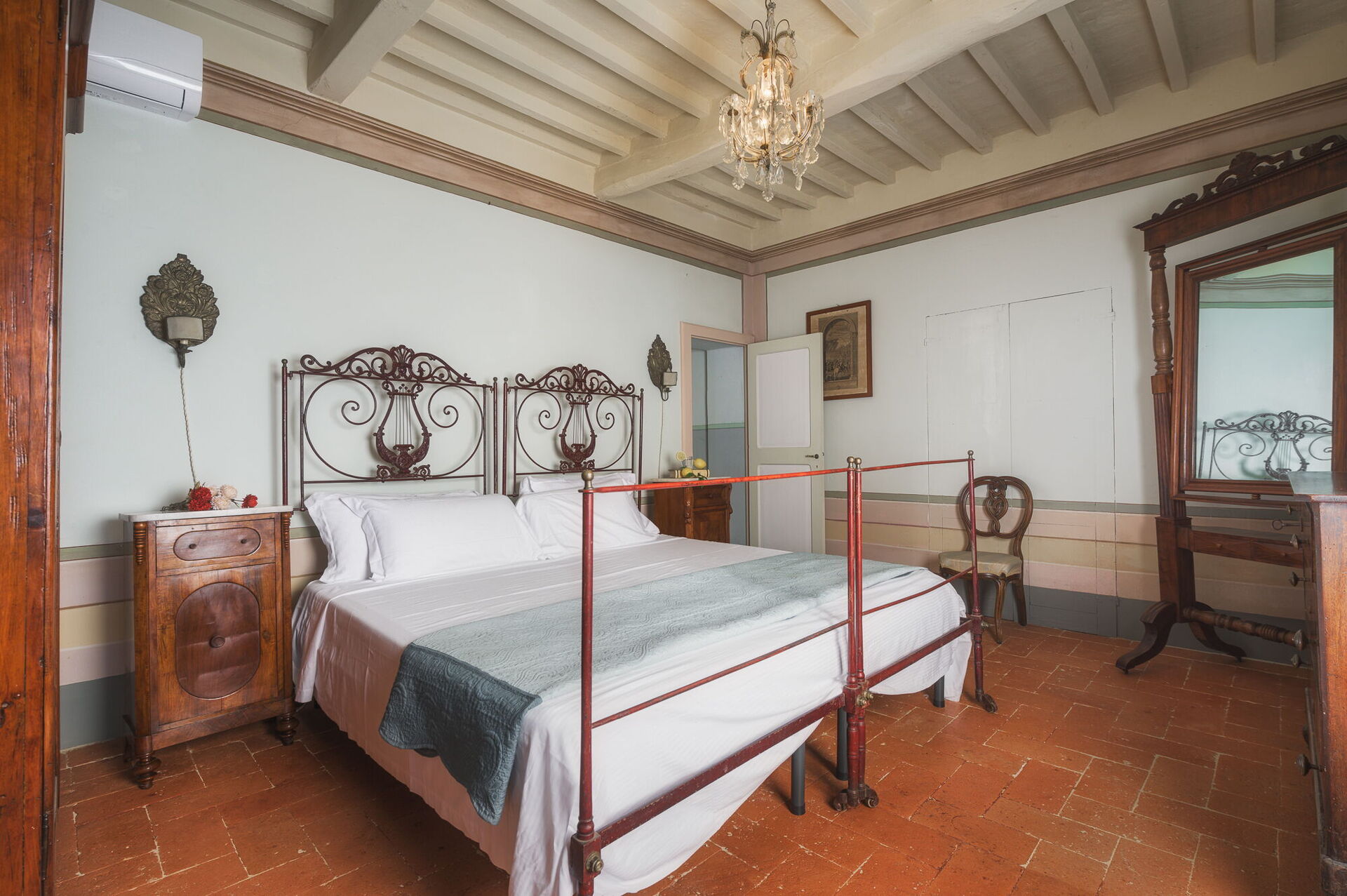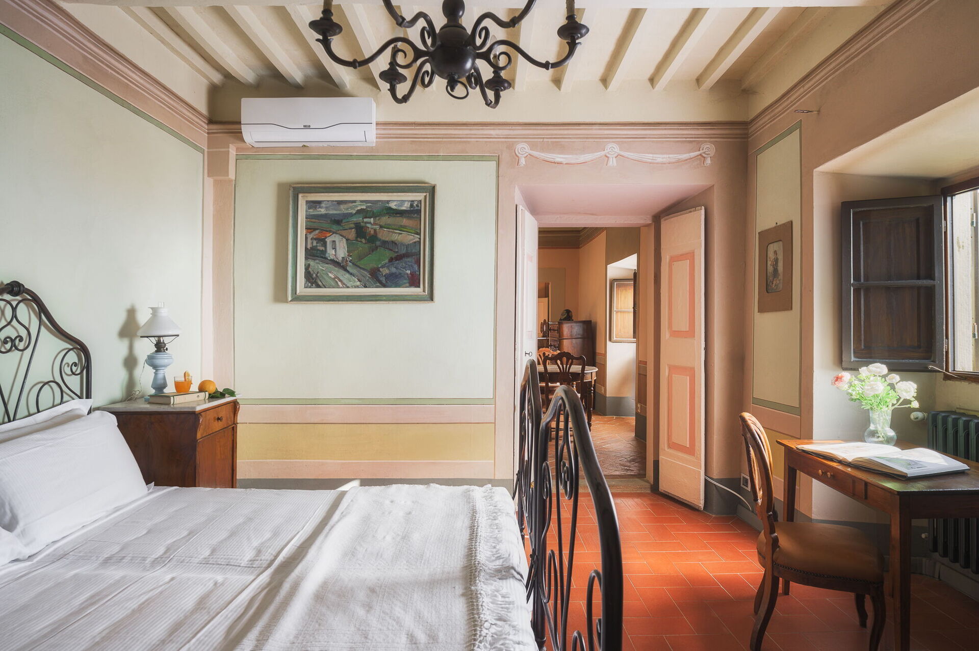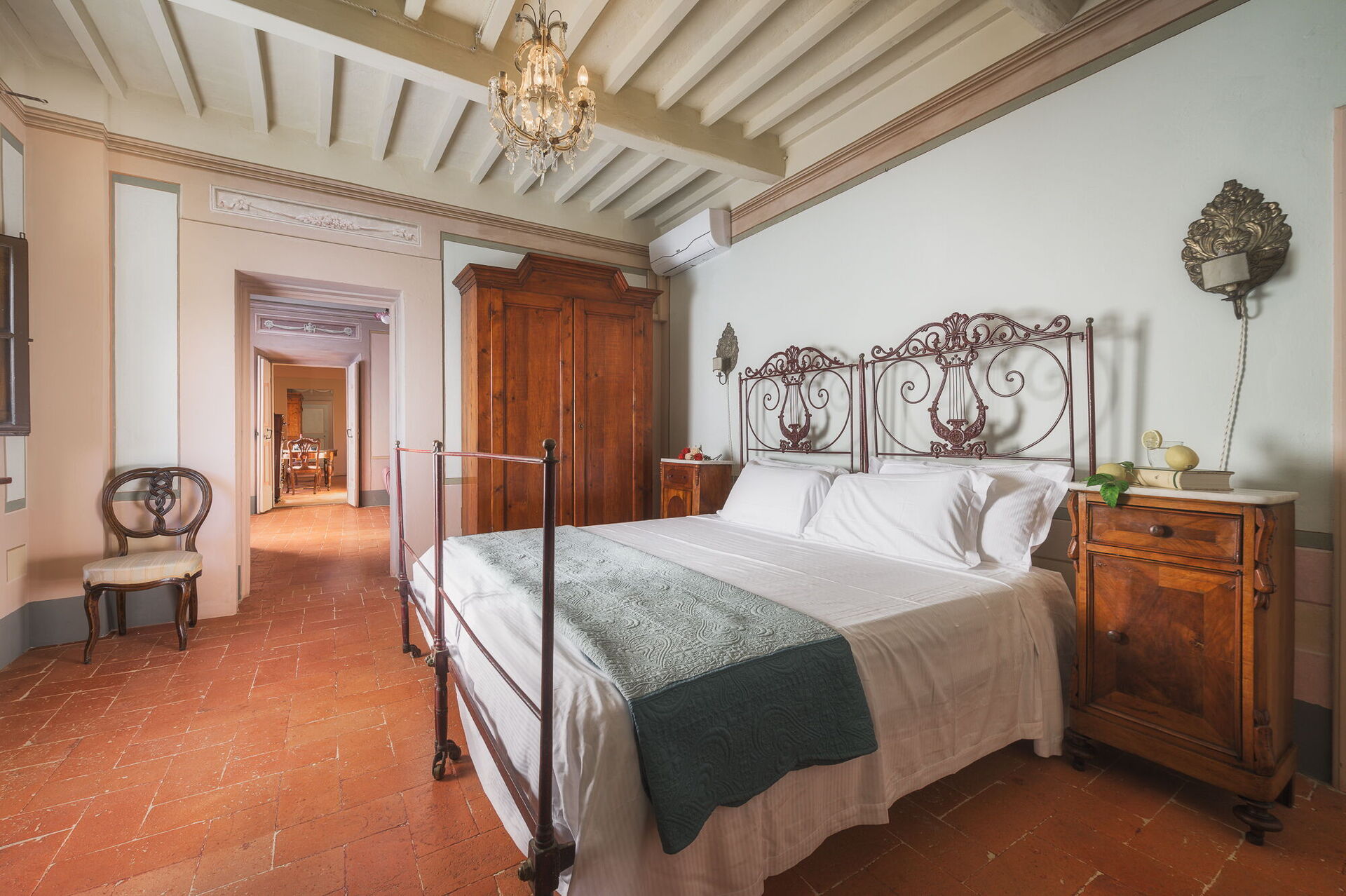 Andra våningen: svit med ett litet vardagsrum, dubbelrum och privat badrum med dusch; dubbelrum, sovrum med fransk säng. De två sovrummen delar badrum (med ingång från båda rummen).