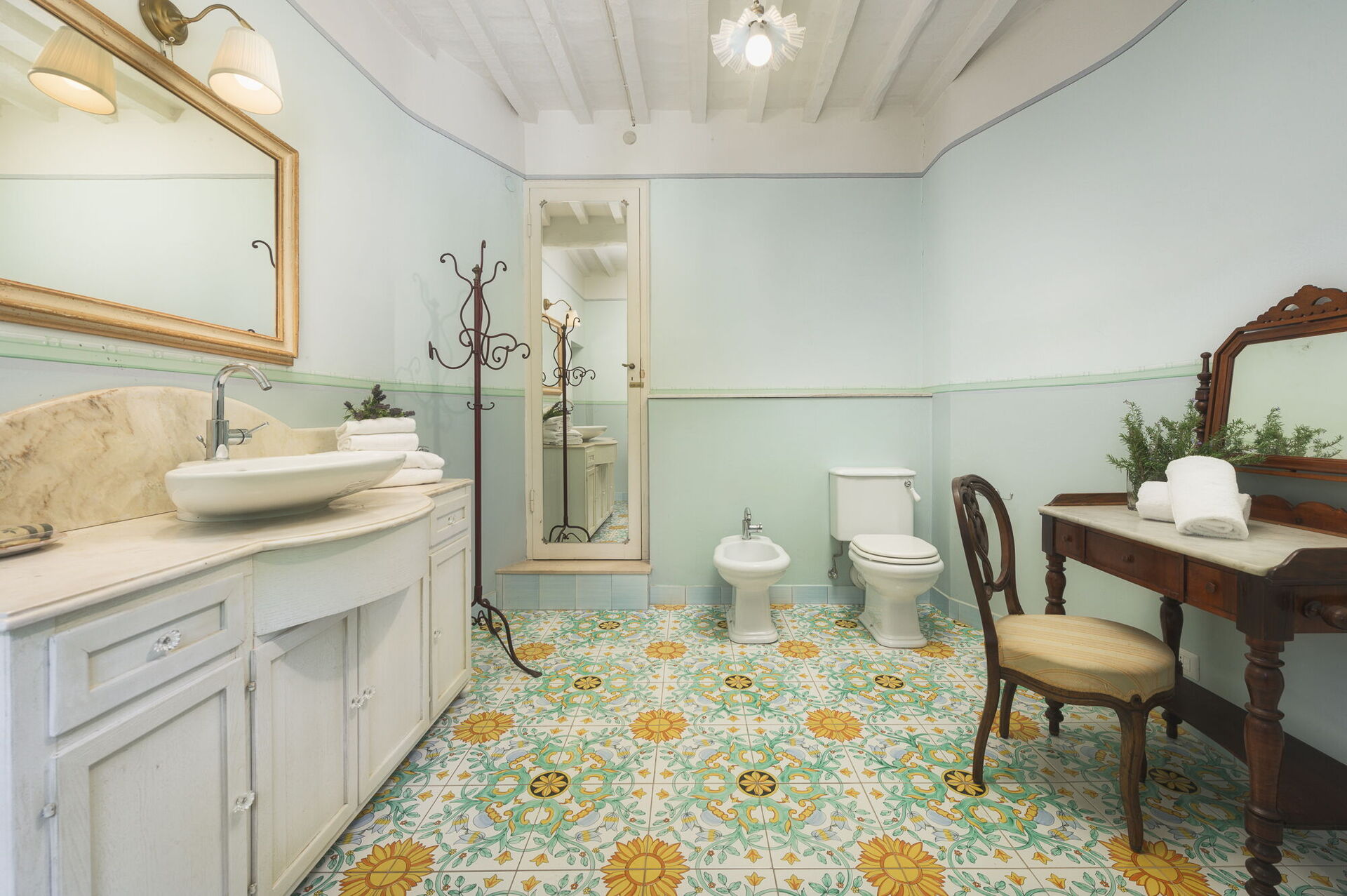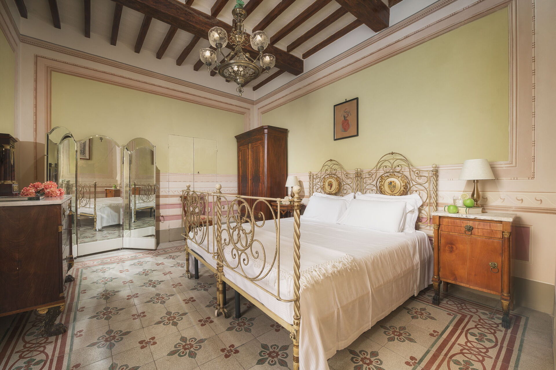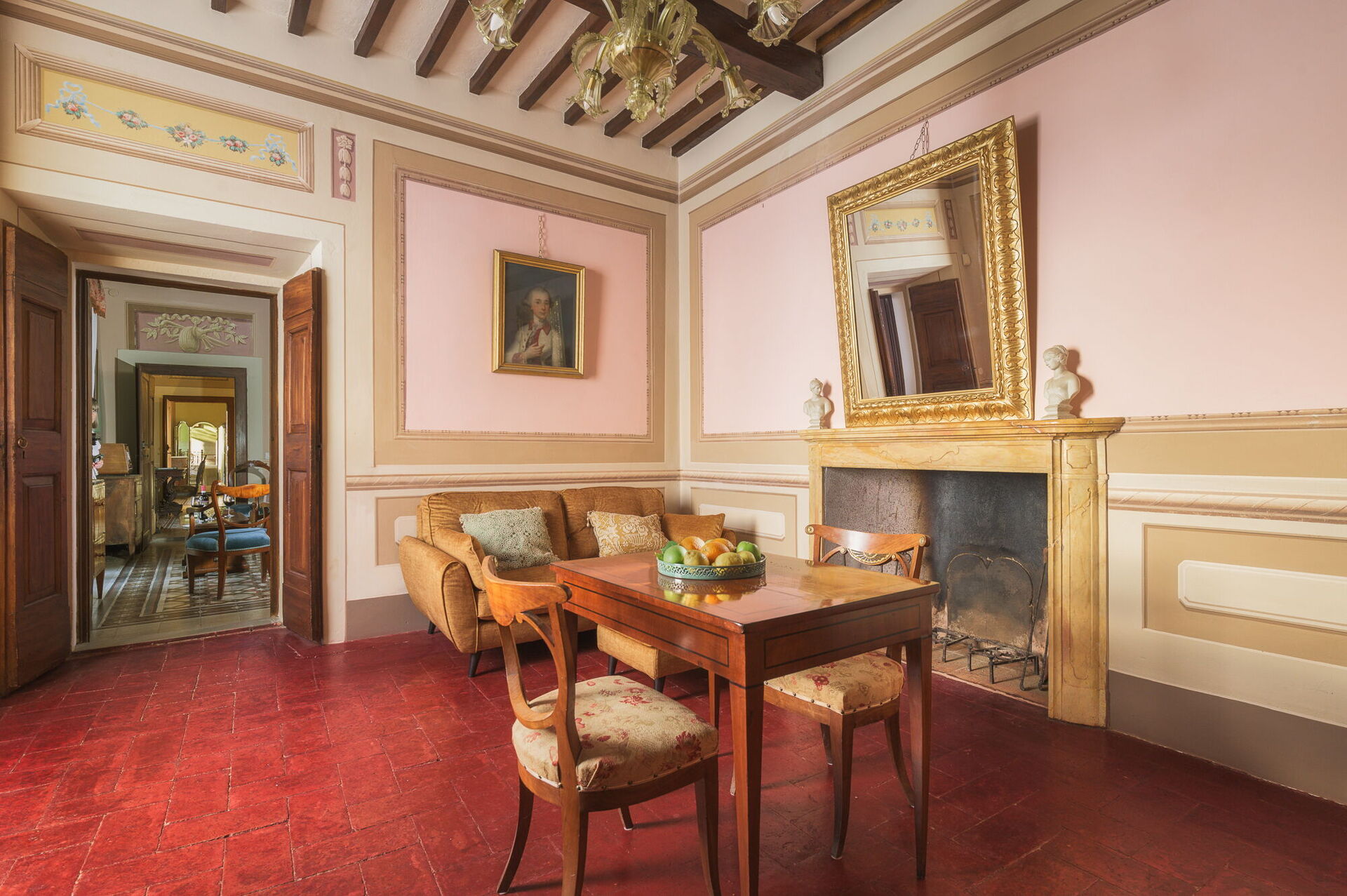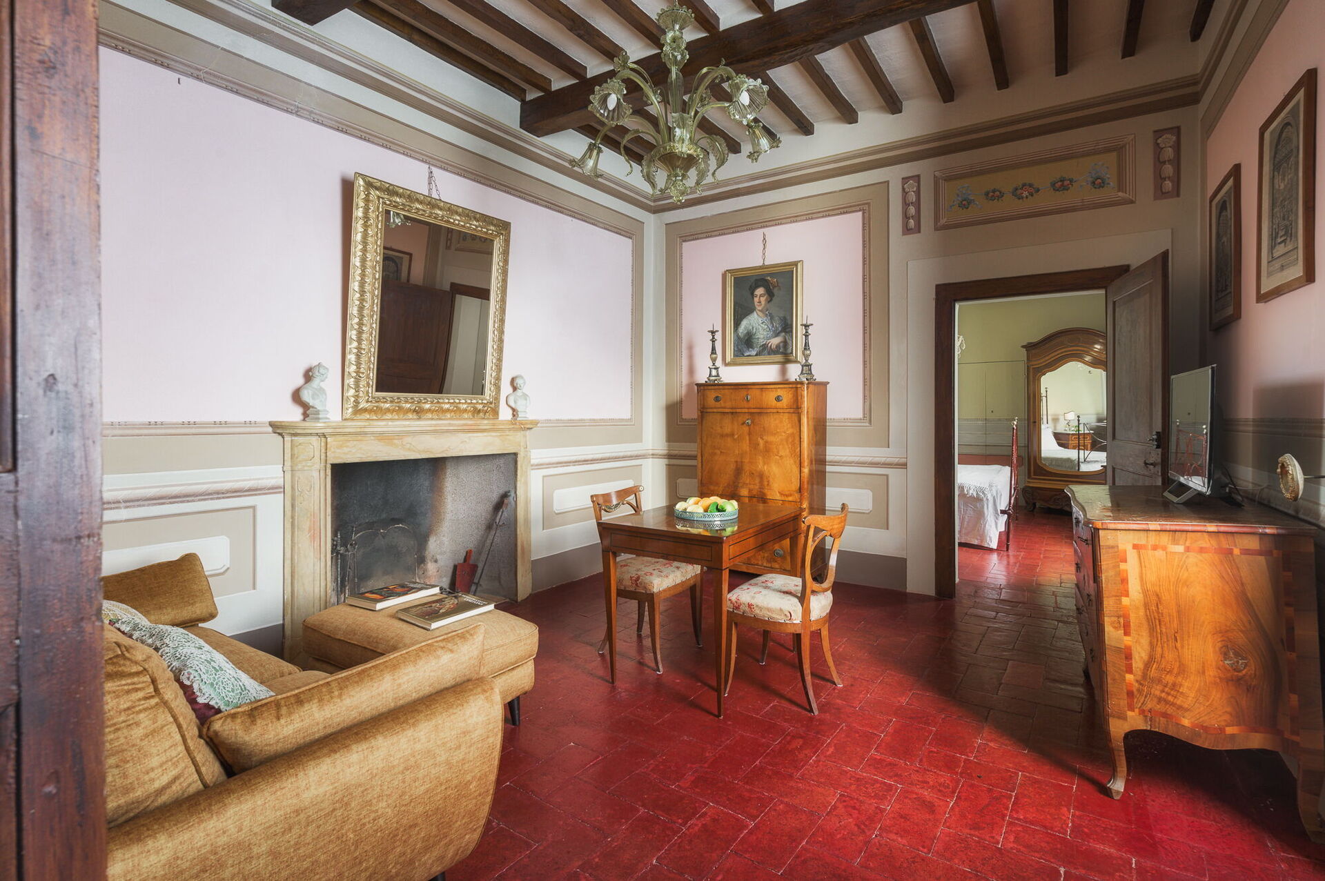 Andra våningen: svit med ett litet vardagsrum, dubbelrum och privat badrum med dusch; dubbelrum, sovrum med fransk säng. De två sovrummen delar badrum (med ingång från båda rummen).