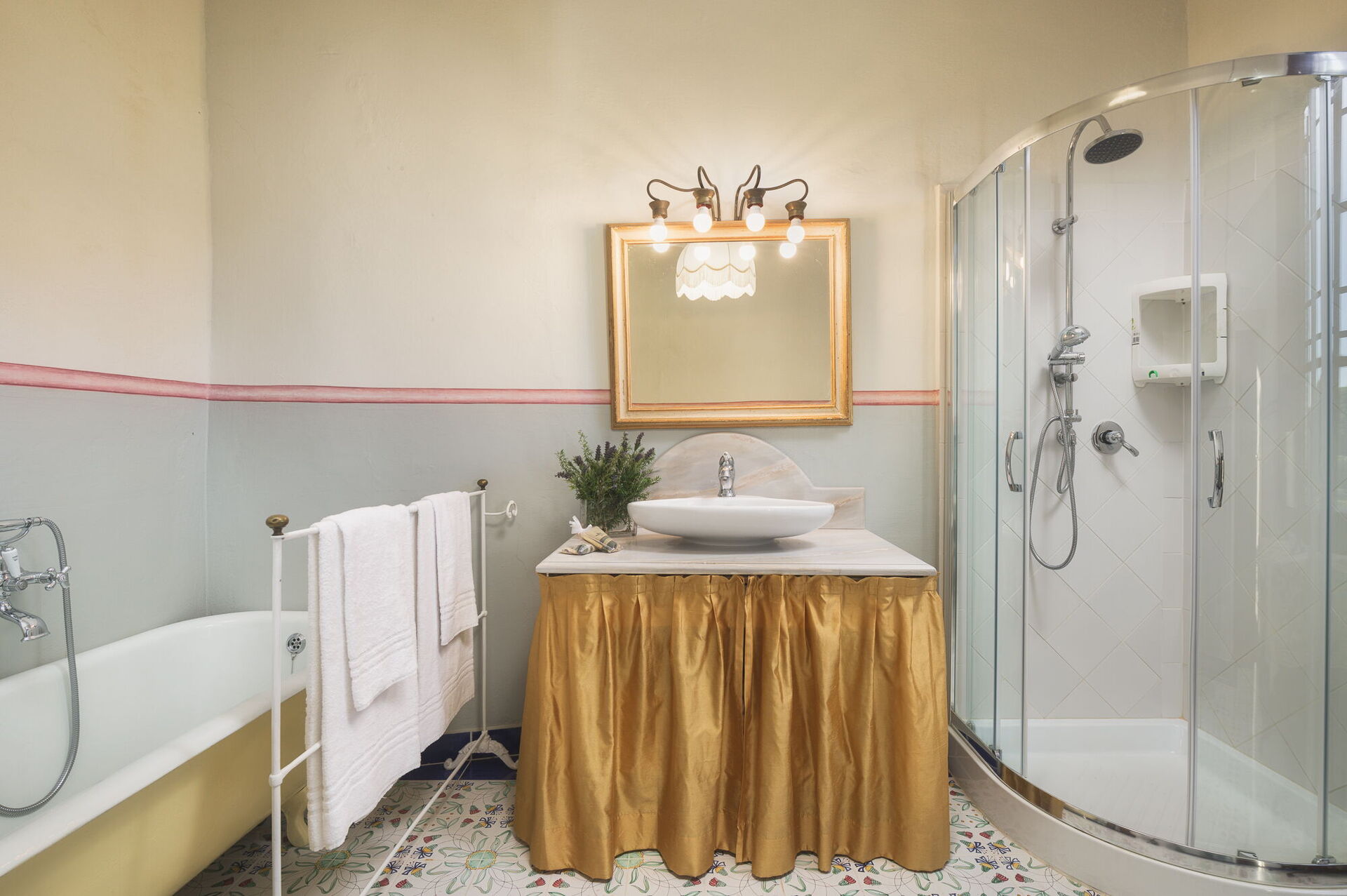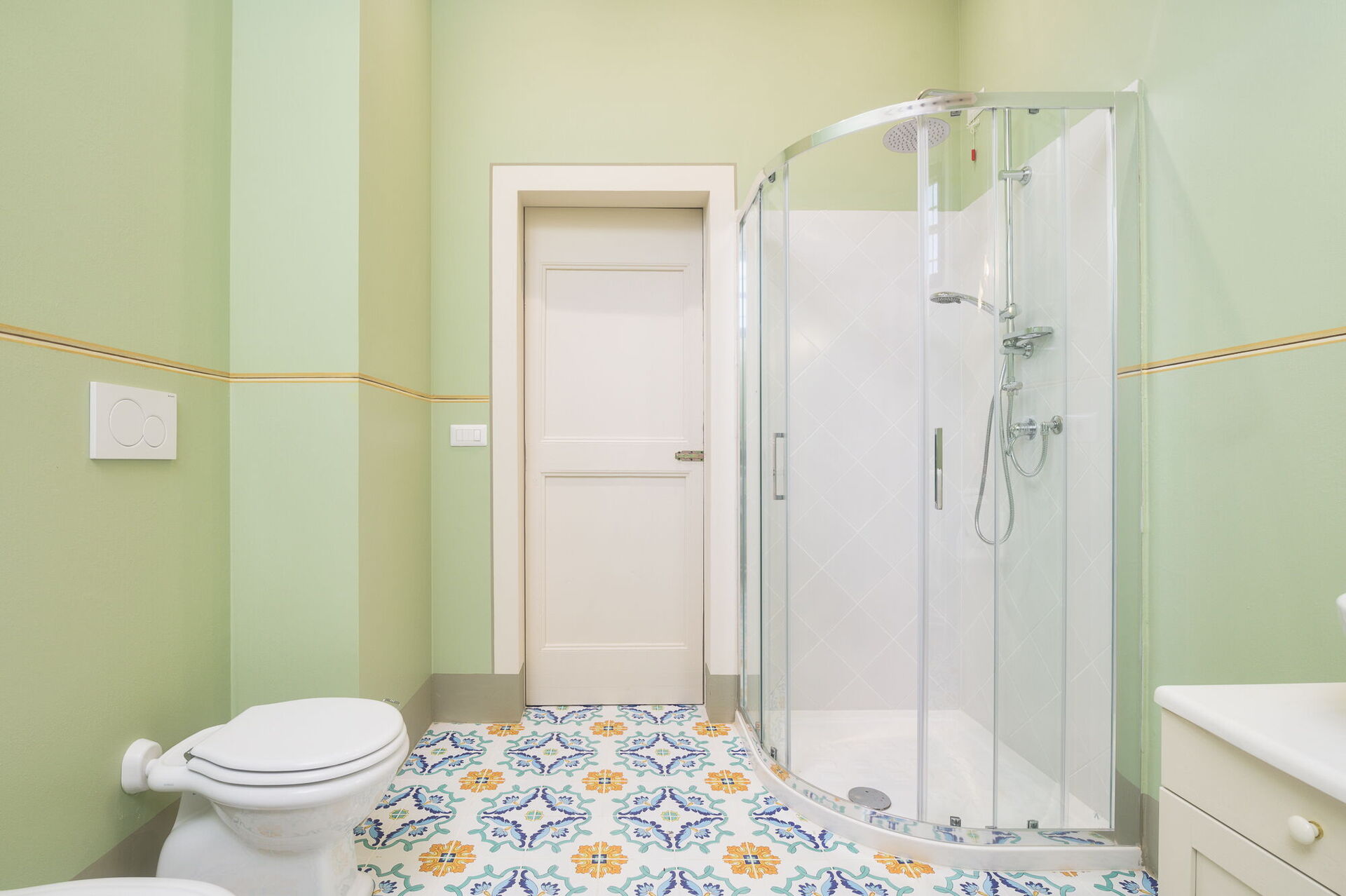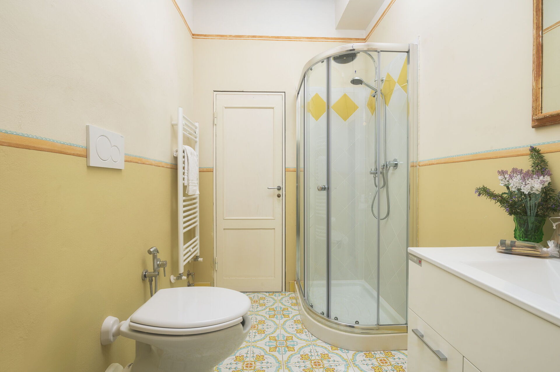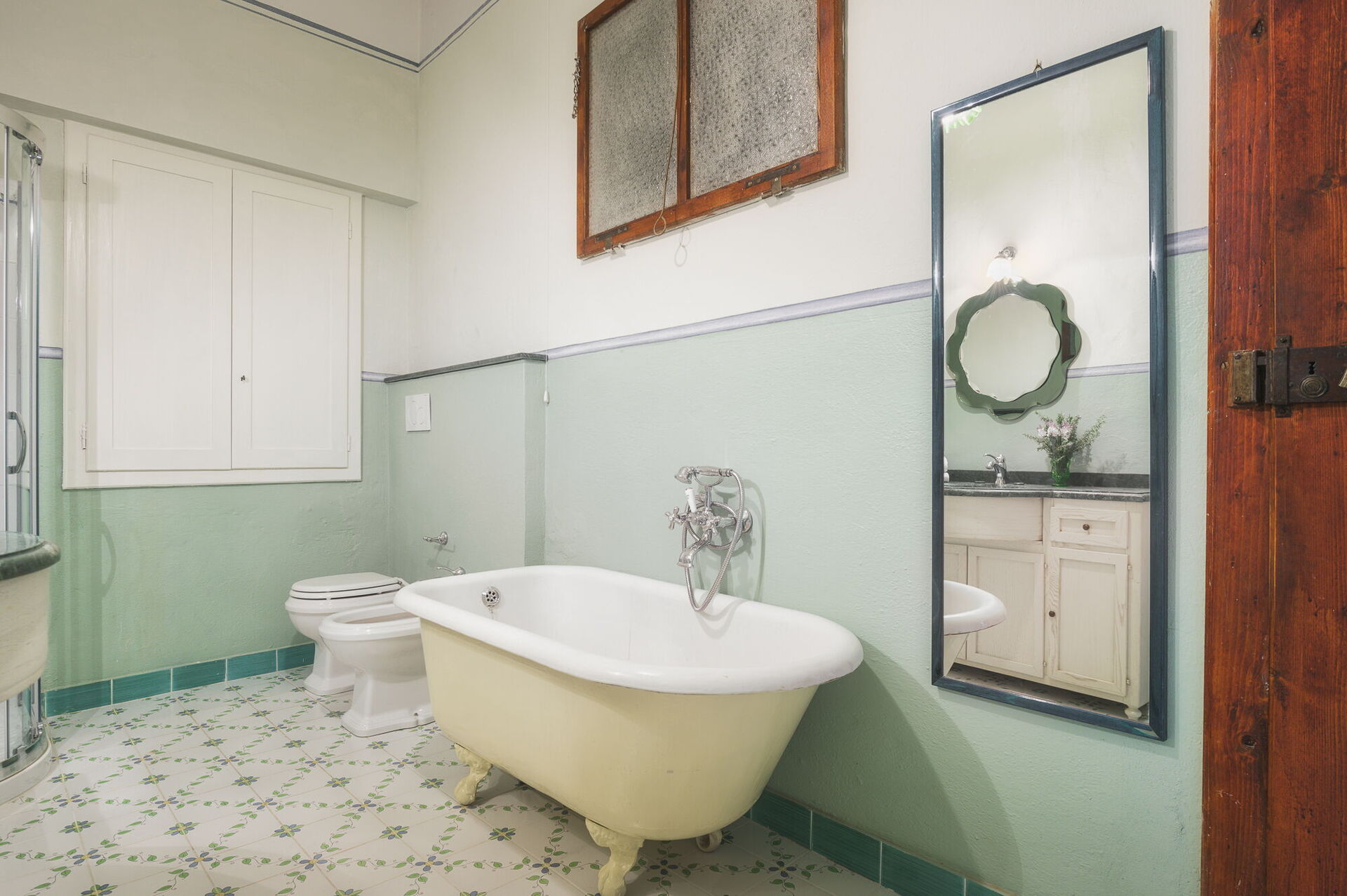 Andra våningen: svit med ett litet vardagsrum, dubbelrum och privat badrum med dusch; dubbelrum, sovrum med fransk säng. De två sovrummen delar badrum (med ingång från båda rummen).
