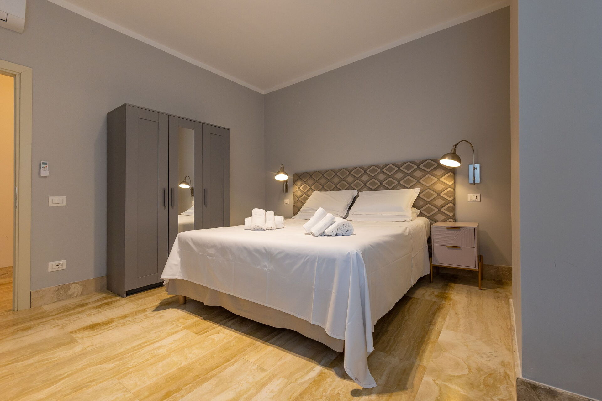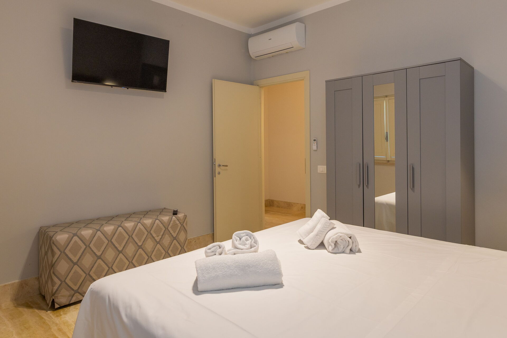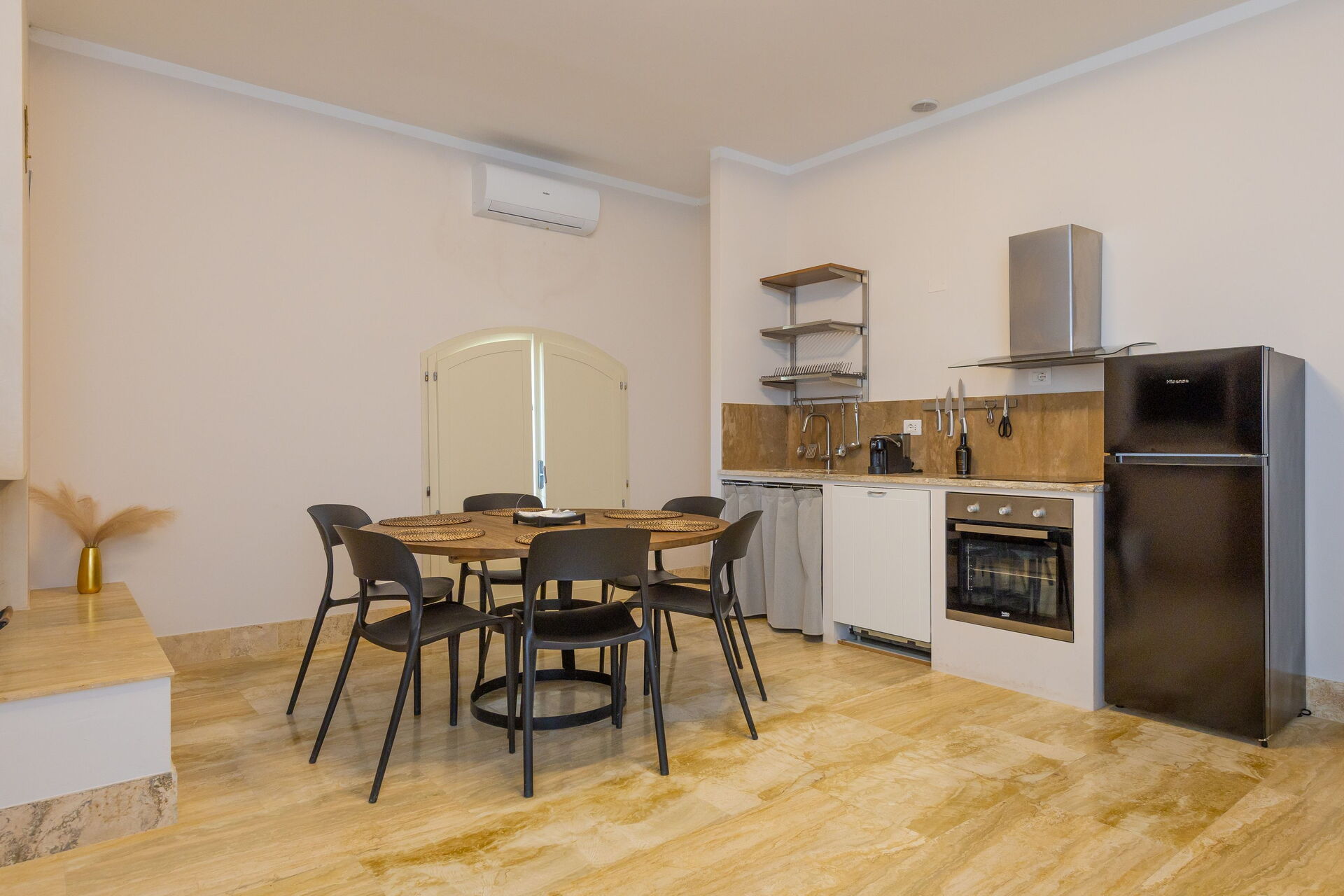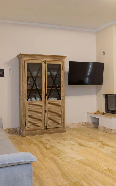 Första våningen: vardagsrum (smart-TV, luftkonditionering) med bäddsoffa för två, matplats och pentry (diskmaskin, ugn, kylskåp, espressobryggare, brödrost), 2 dubbelrum (varje med luftkonditionering), badrum med dusch.