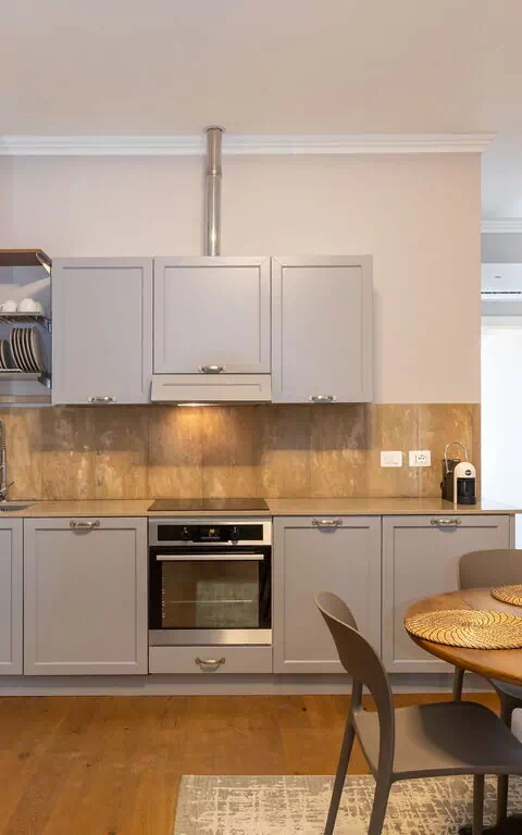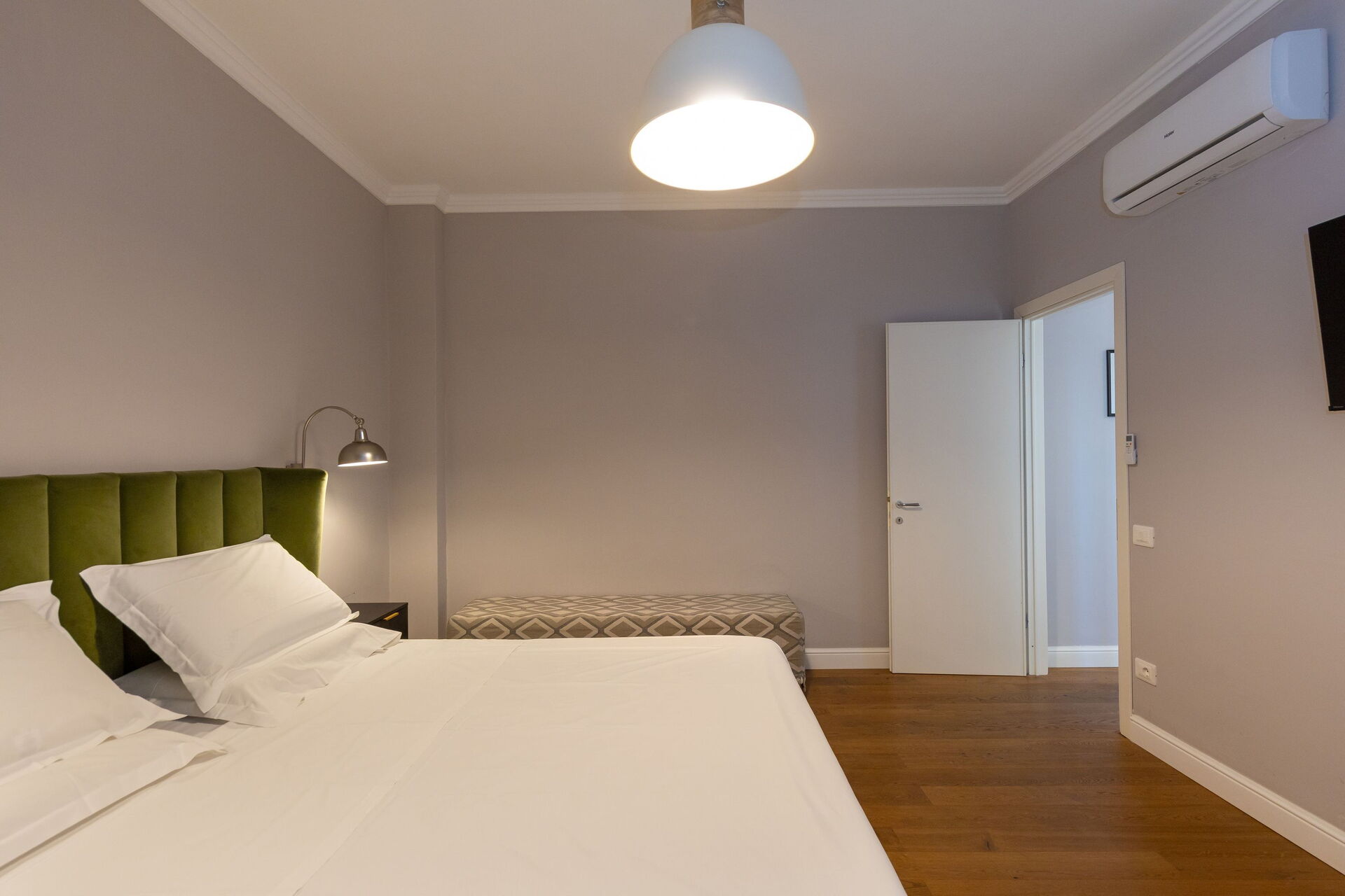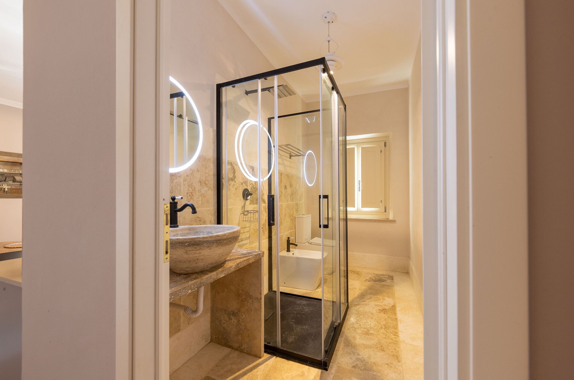 Första våningen: vardagsrum (smart-TV, luftkonditionering) med bäddsoffa för två, matplats och kokvrå (diskmaskin, ugn, kylskåp, espressobryggare, brödrost), dubbelrum (luftkonditionering), badrum med dusch.