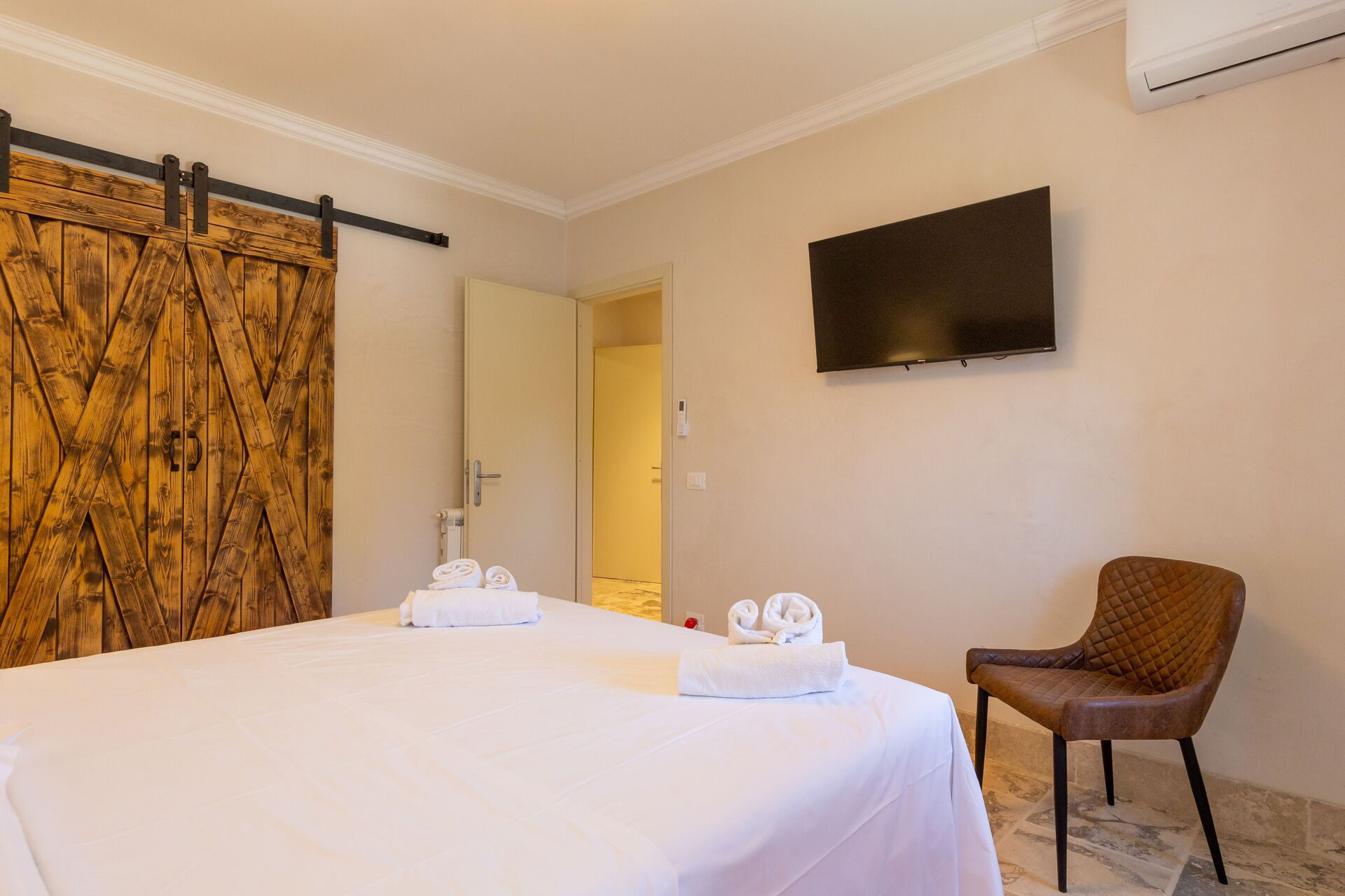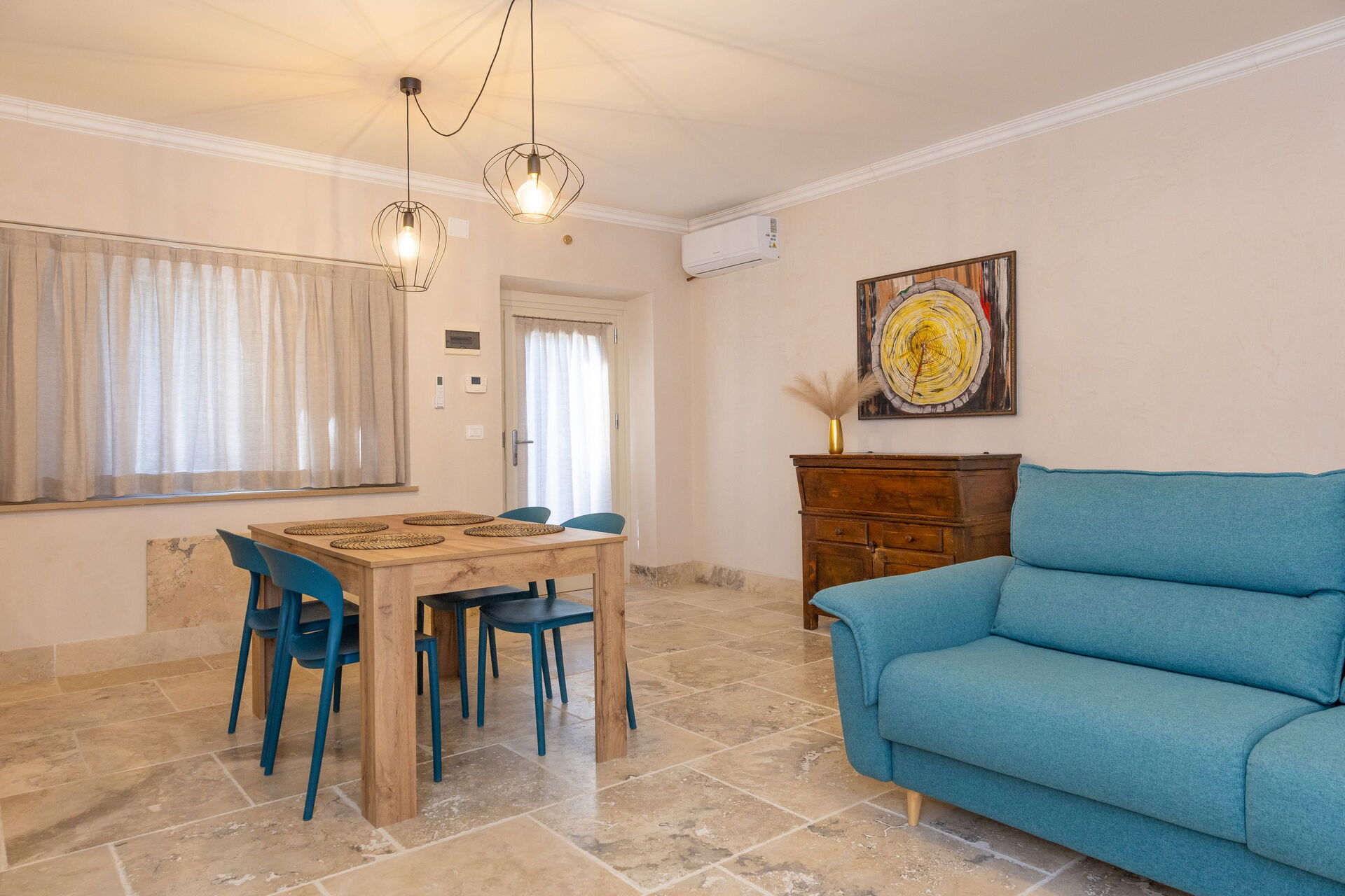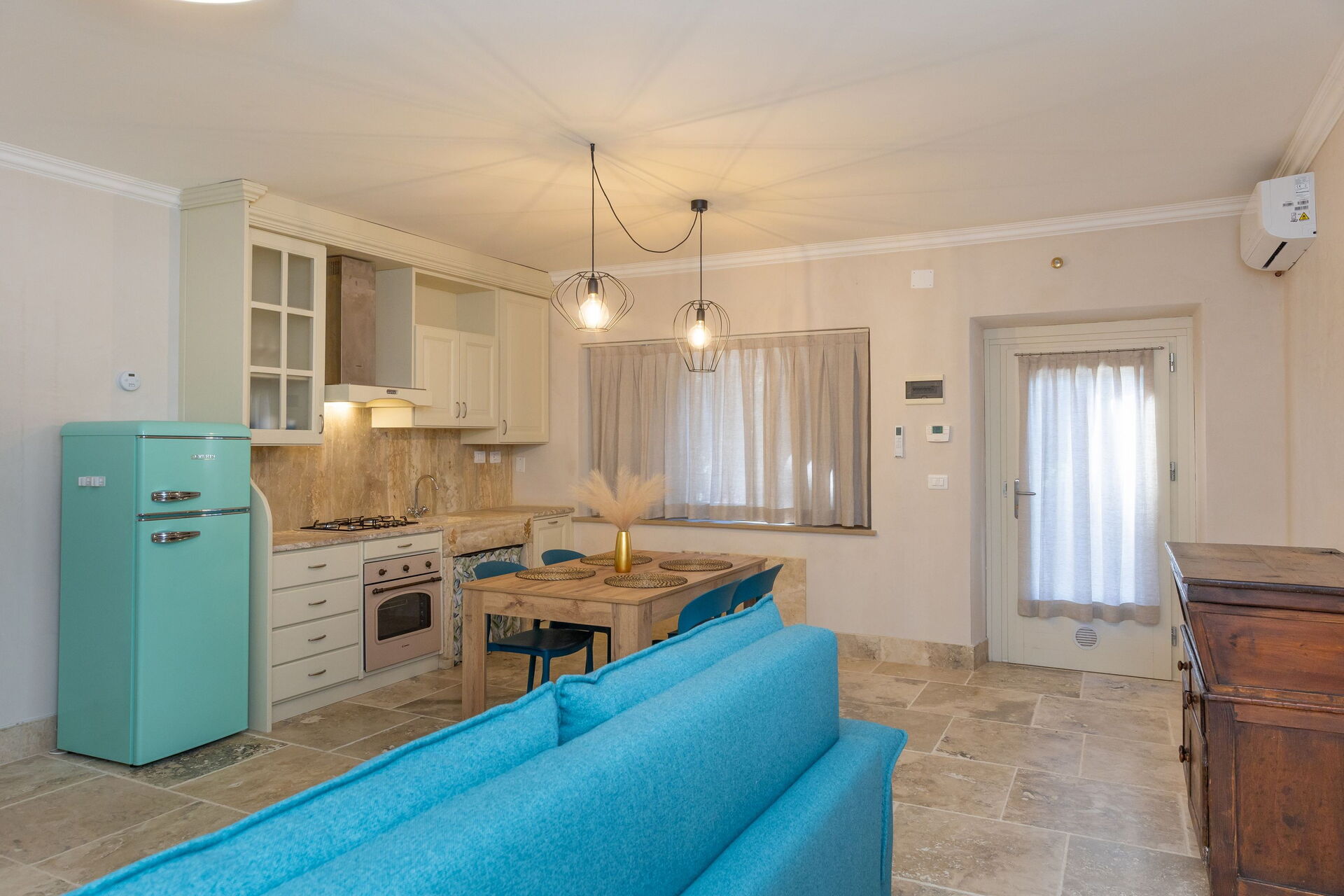 Höjd bottenvåning: vardagsrum (smart-TV, luftkonditionering) med bäddsoffa för två, matplats och pentry (diskmaskin, ugn, kylskåp, espressomaskin, brödrost), dubbelrum (luftkonditionering), badrum med dusch.
