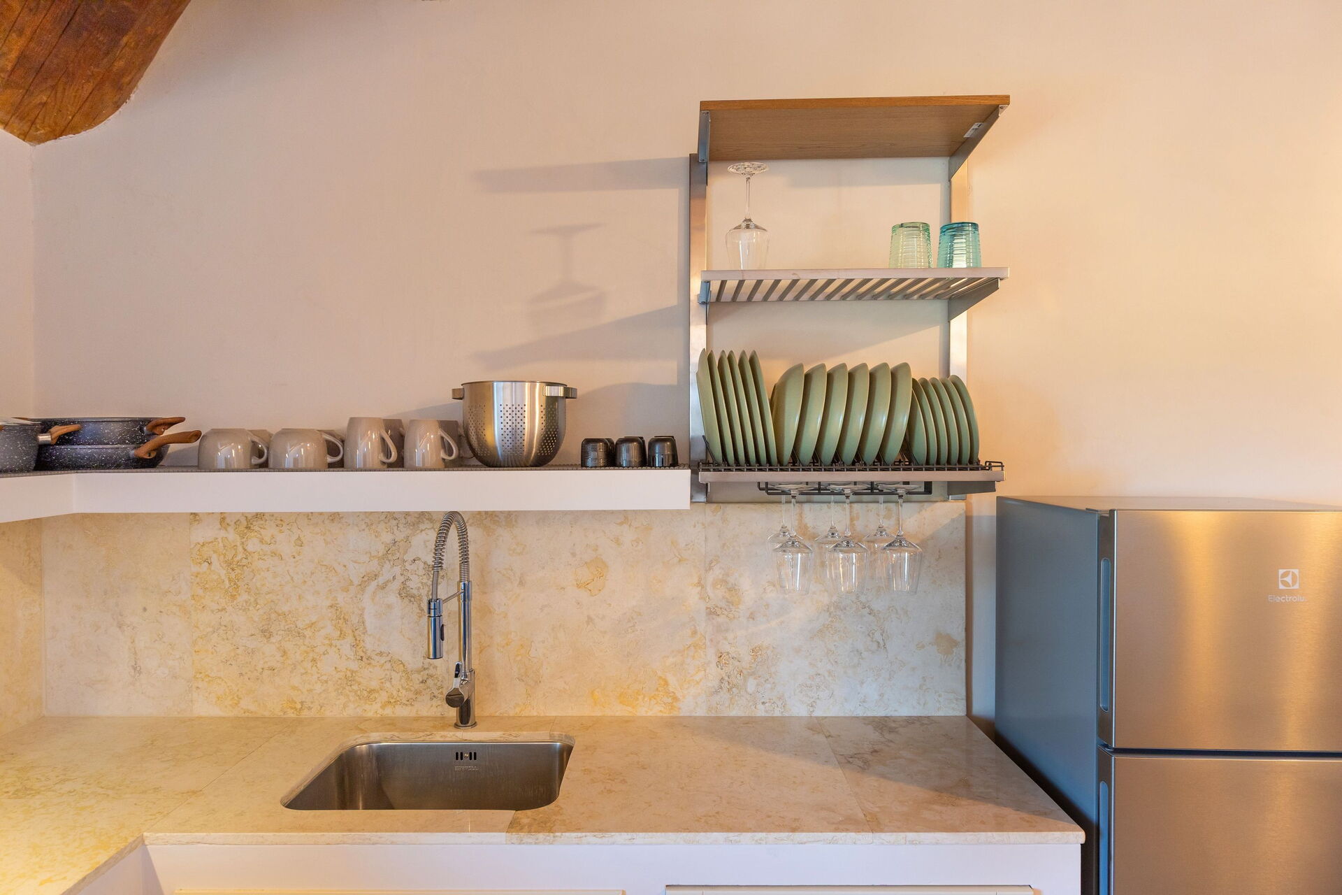 Första våningen: vardagsrum (smart-TV, luftkonditionering) med bäddsoffa för två, matplats och pentry (diskmaskin, ugn, kylskåp, espressomaskin, brödrost), sovrum med dubbelsäng (luftkonditionering), badrum med dusch.