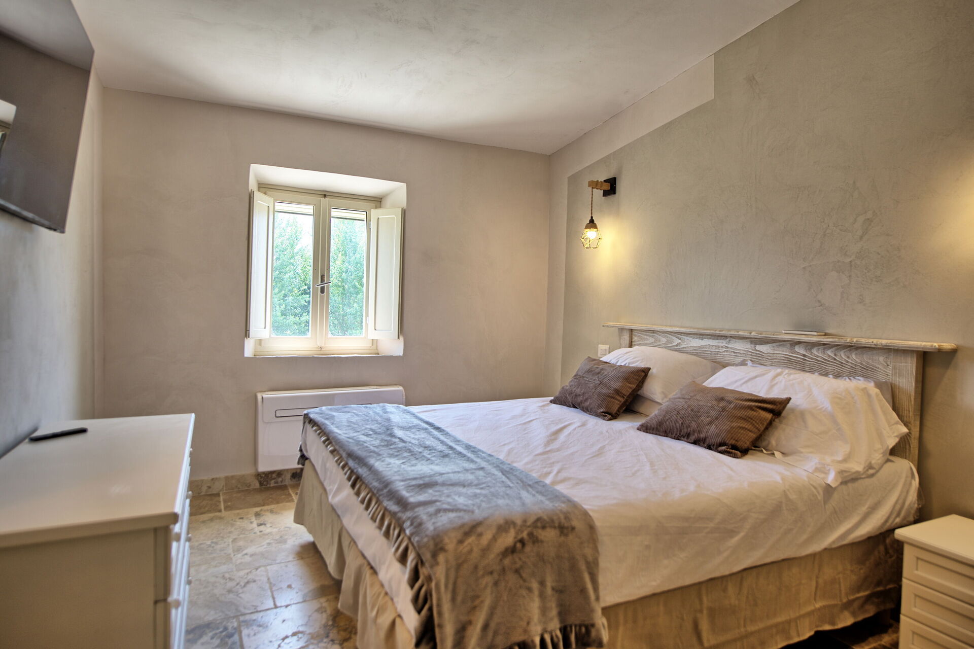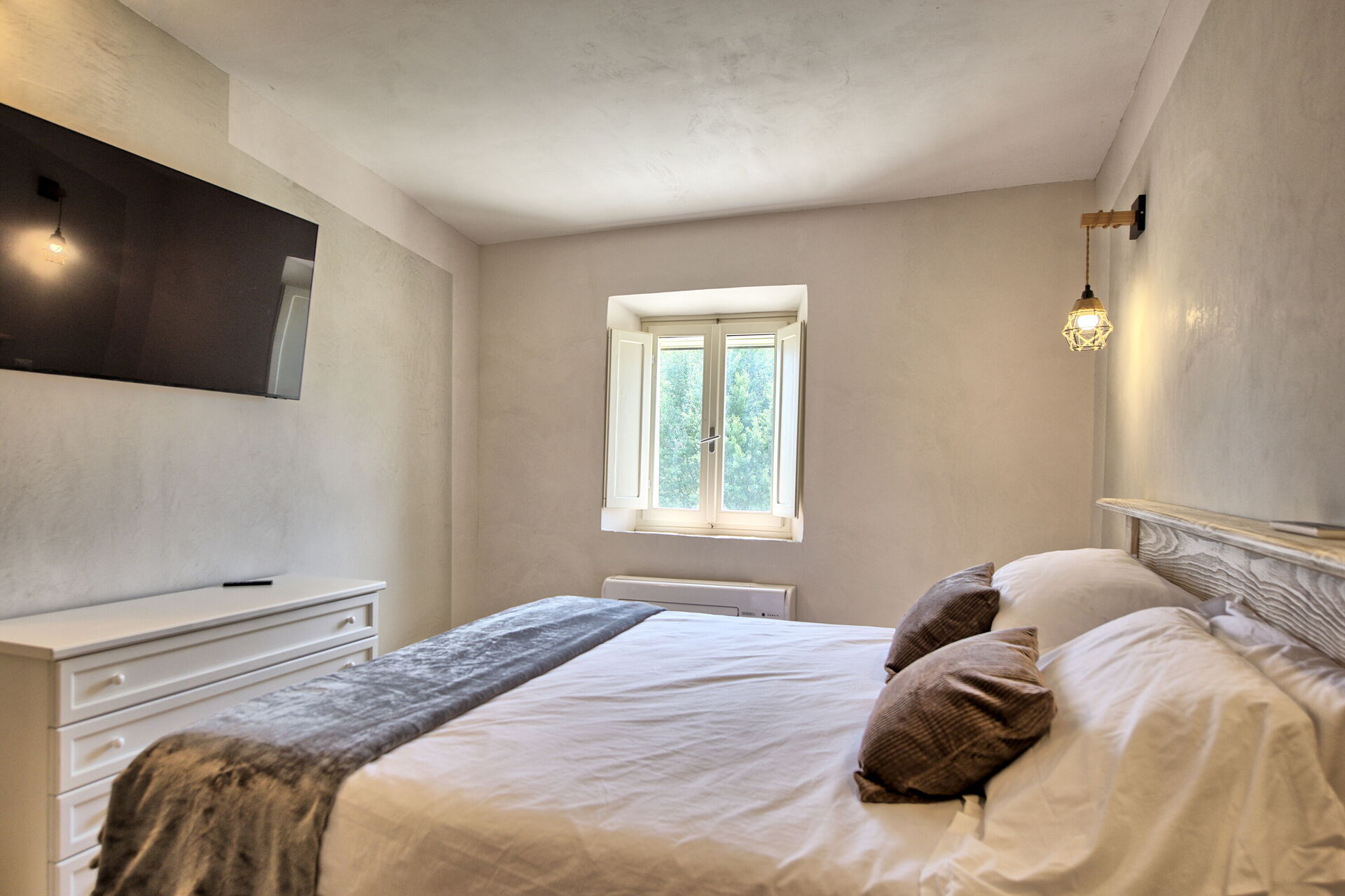 Höjd bottenvåning: vardagsrum (smart-TV, luftkonditionering) med bäddsoffa för två, matplats och pentry (diskmaskin, ugn, kylskåp, espressomaskin, brödrost), 2 dubbelrum (vardera med luftkonditionering), badrum med dusch.