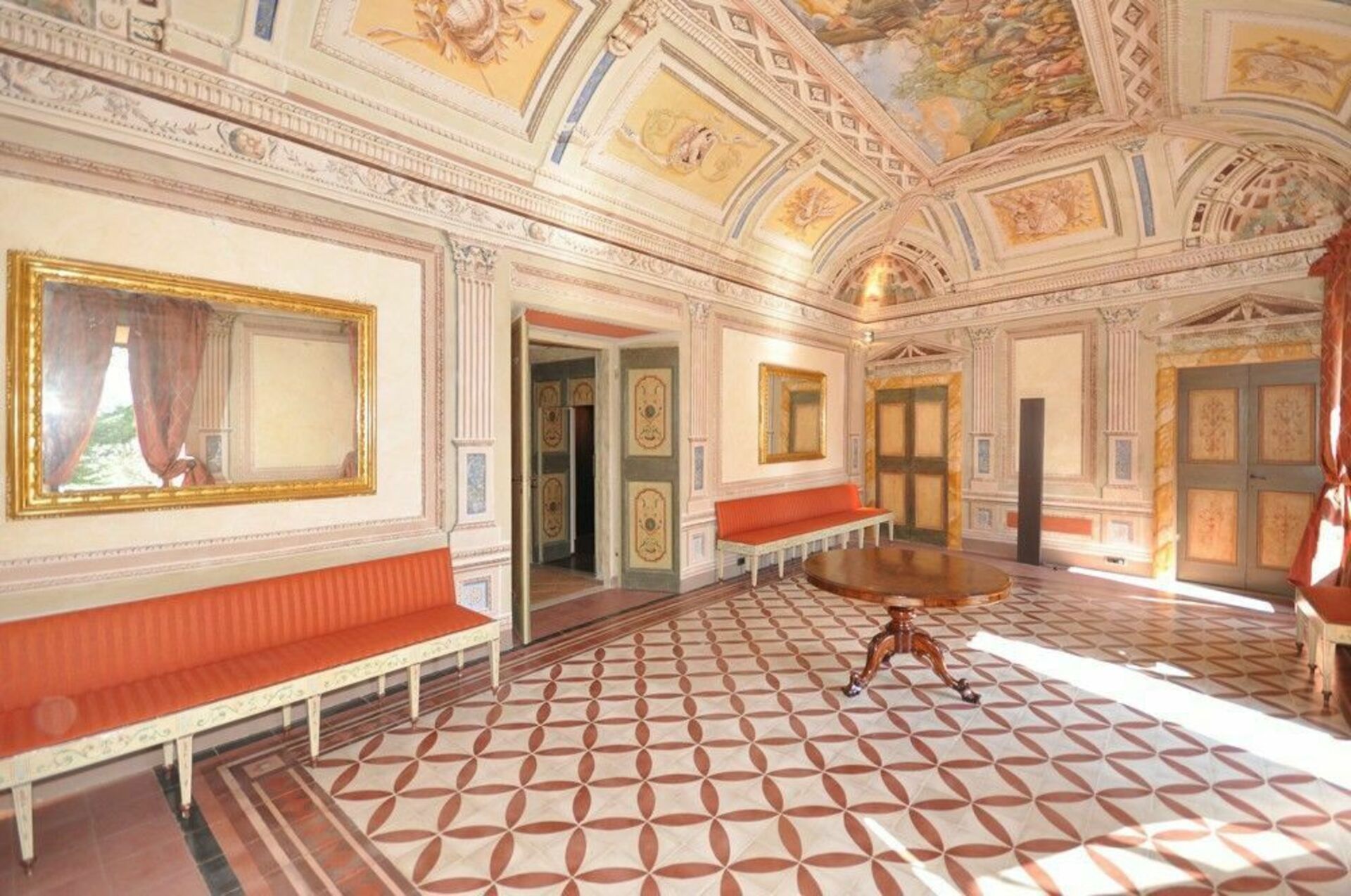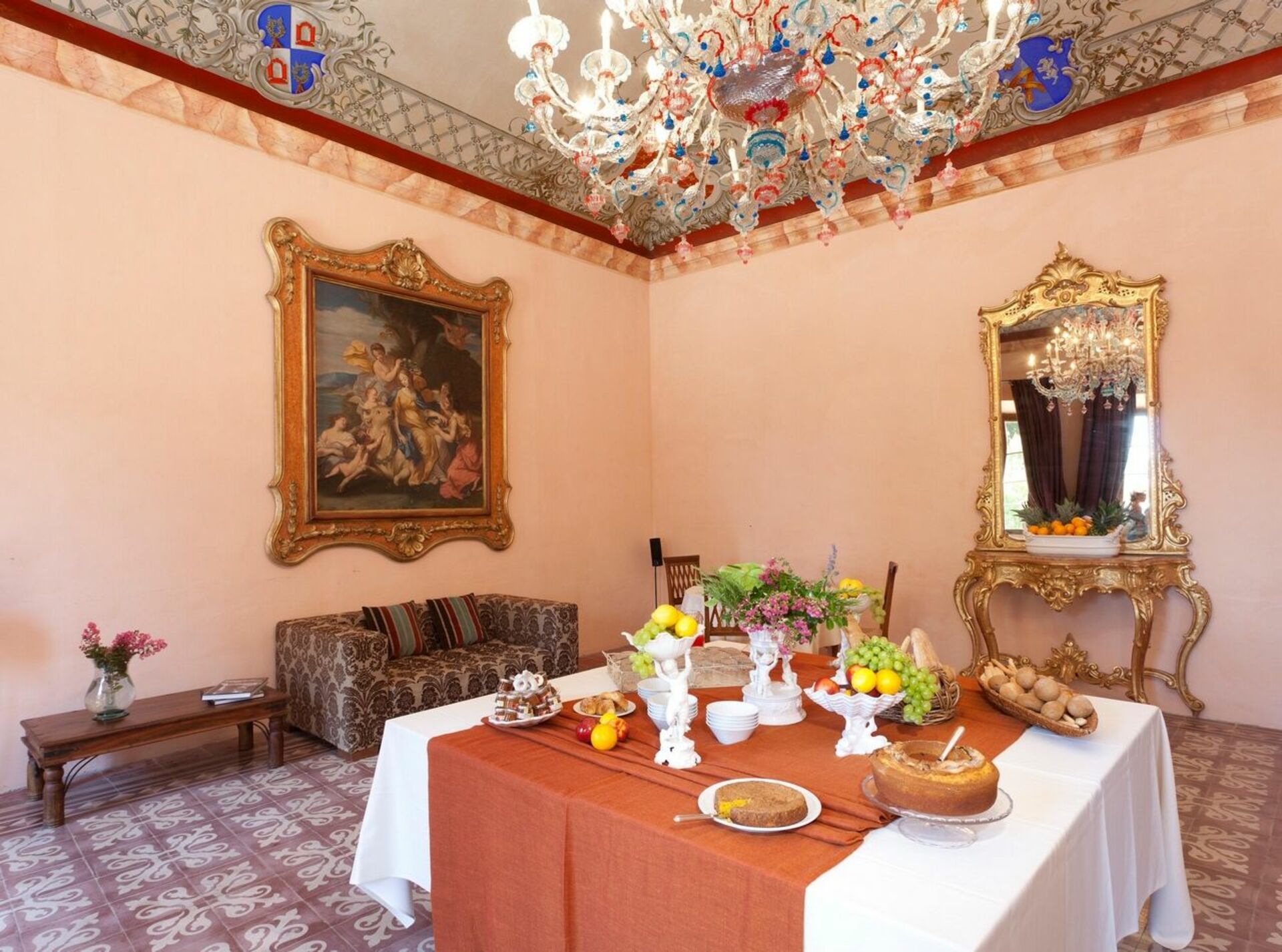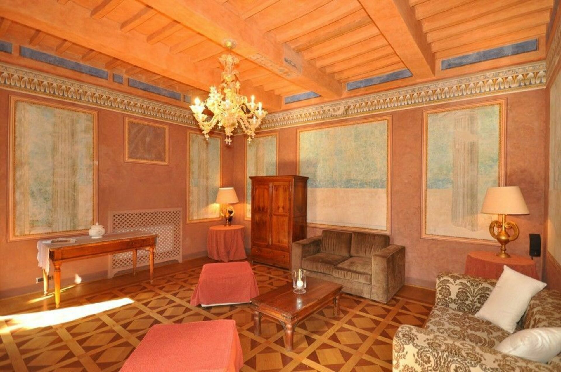 Bottenvåningen: stora salar med fresker, 4 vardagsrum-rum (ett med satellit-TV), 2 toaletter, matsal, kök (kylskåp för drycker, espresso kaffebryggare, ugn, induktionshäll, diskmaskin).