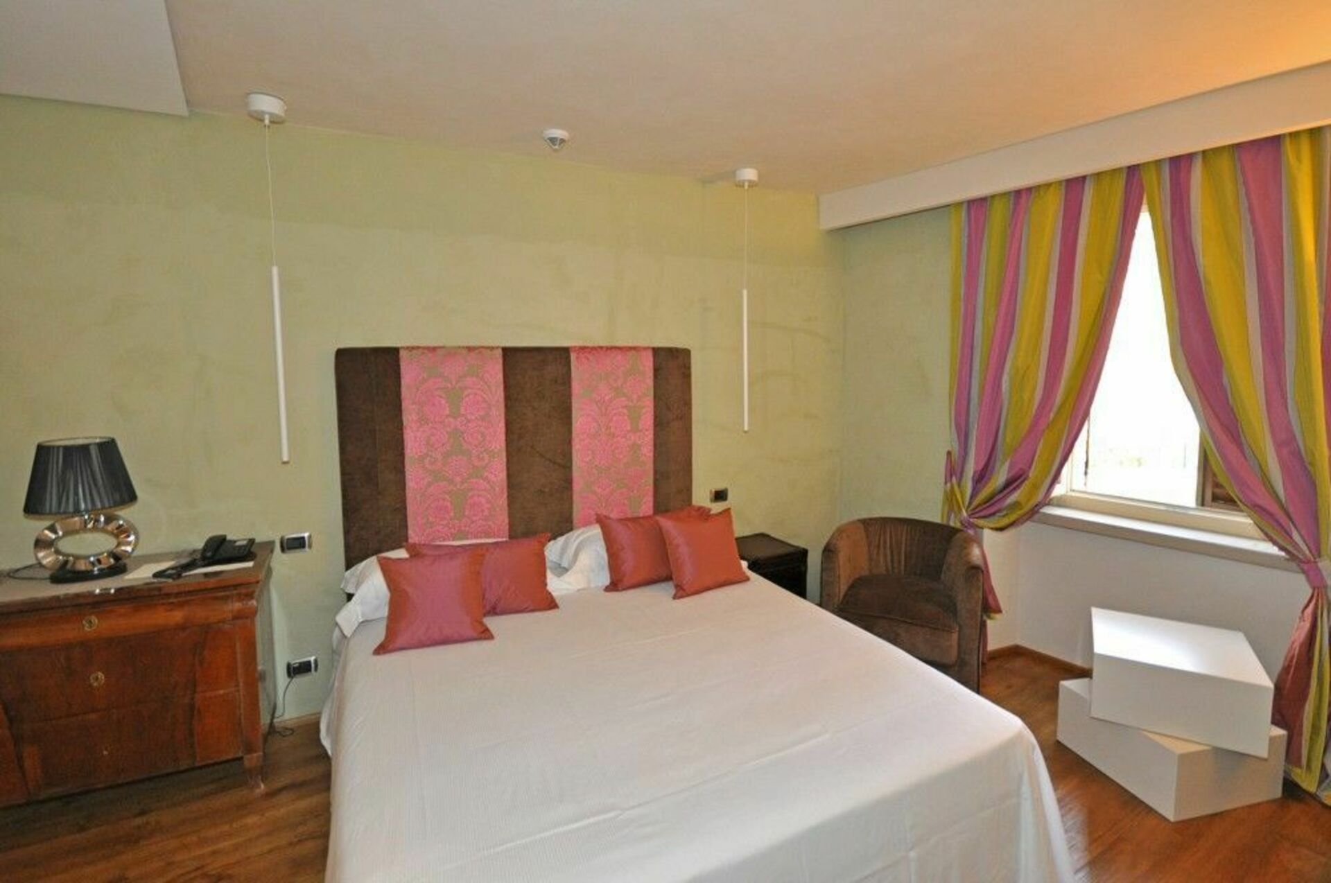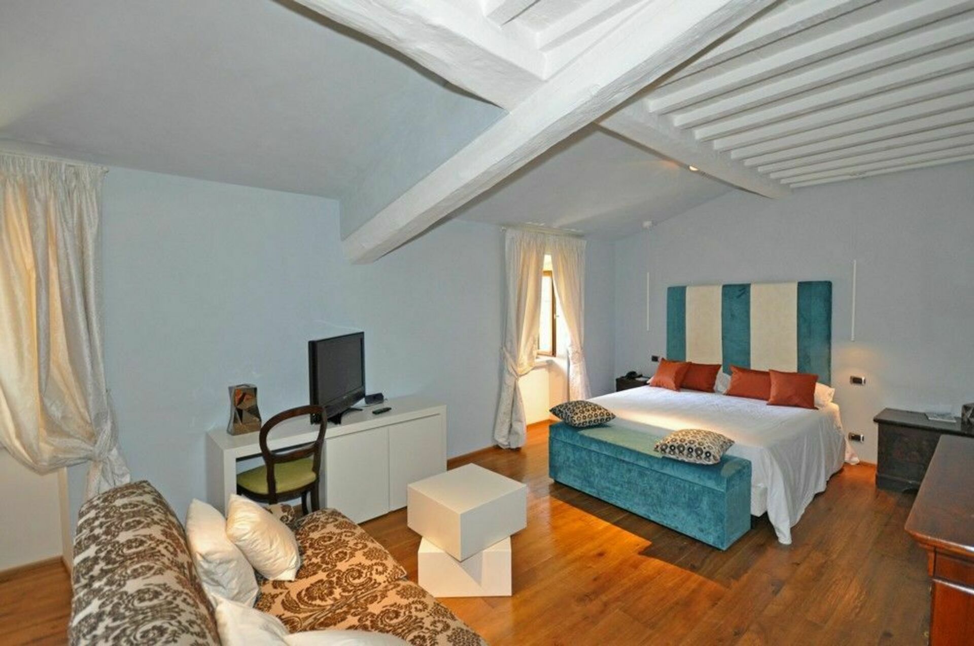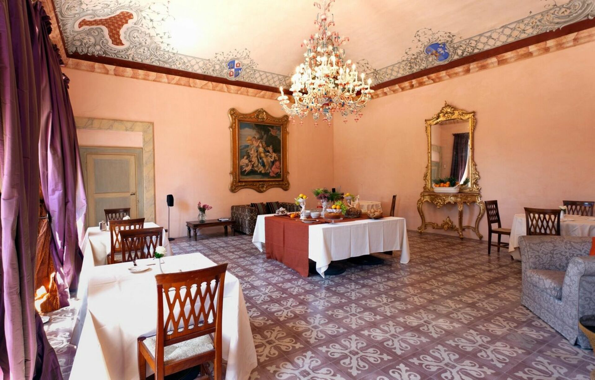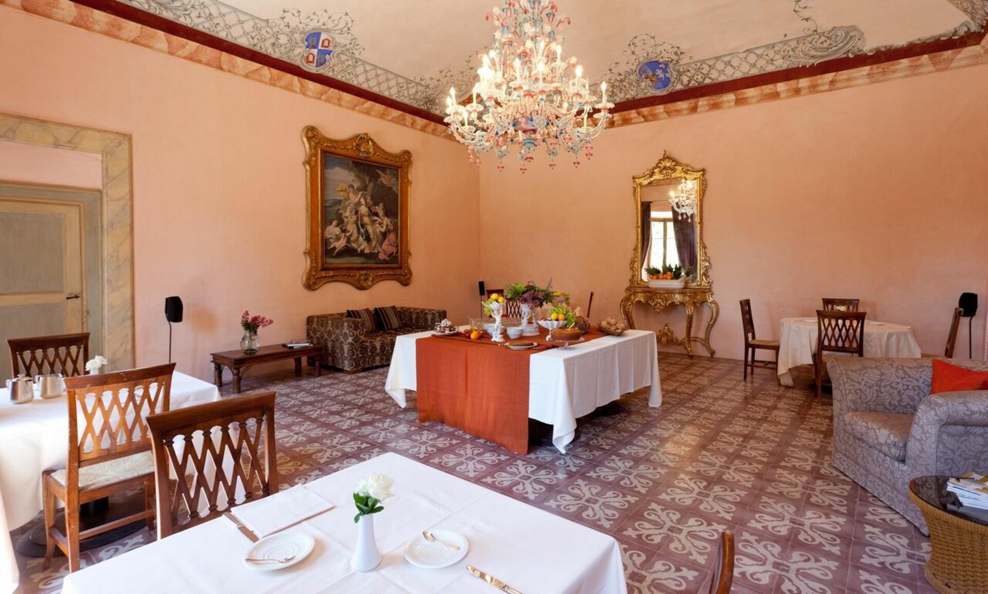 Bottenvåningen: stora salar med fresker, 4 vardagsrum-rum (ett med satellit-TV), 2 toaletter, matsal, kök (kylskåp för drycker, espresso kaffebryggare, ugn, induktionshäll, diskmaskin).