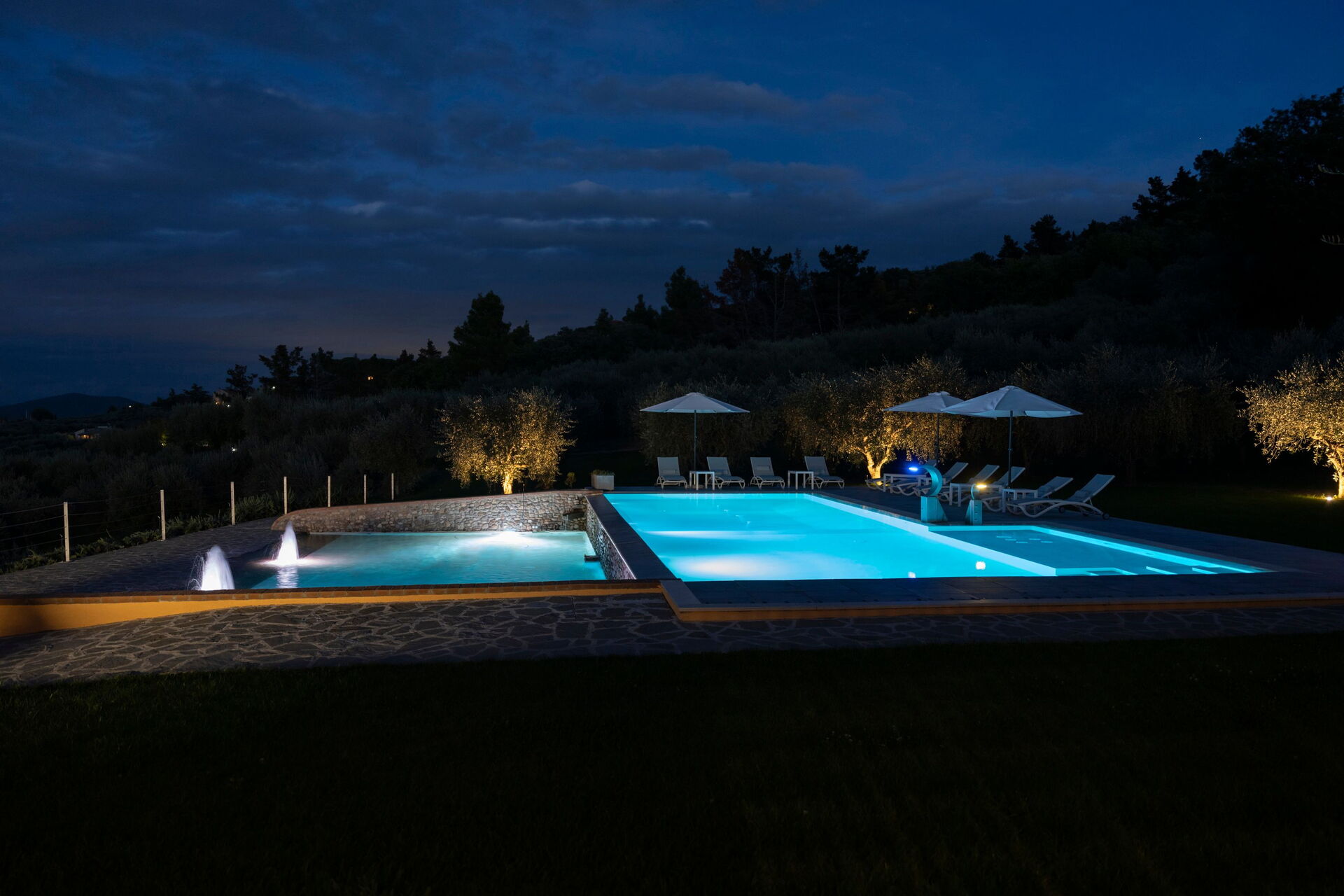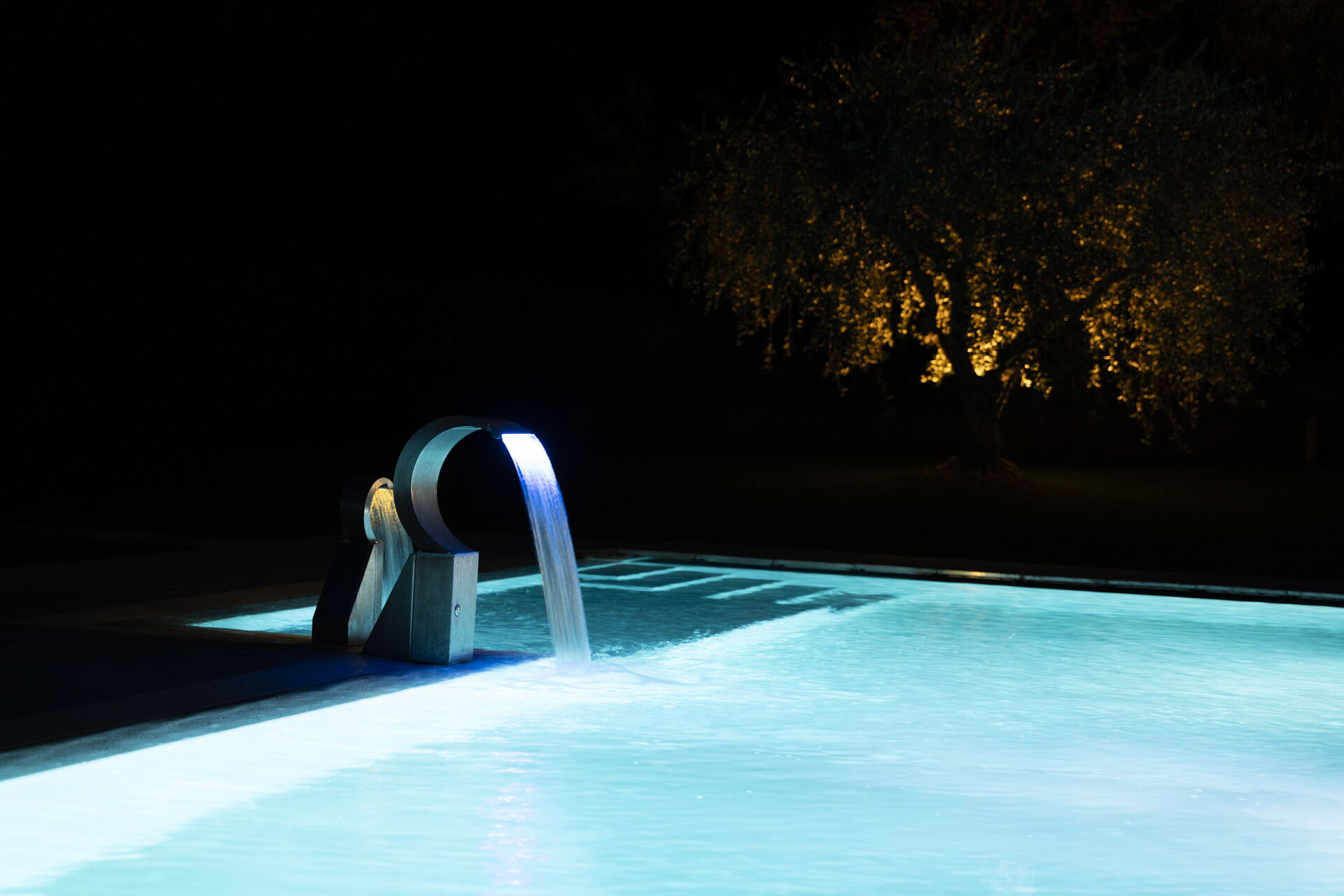 Poolen har en fantastisk panoramautsikt och ett avkopplingsområde med två vattenfall, där vattnet som rinner över kanten rinner ned till en underliggande grund pool, idealisk för barn. En automatisk poolöverdrag håller poolen renare och bibehåller en behaglig vattentemperatur även under de kallare årstiderna.