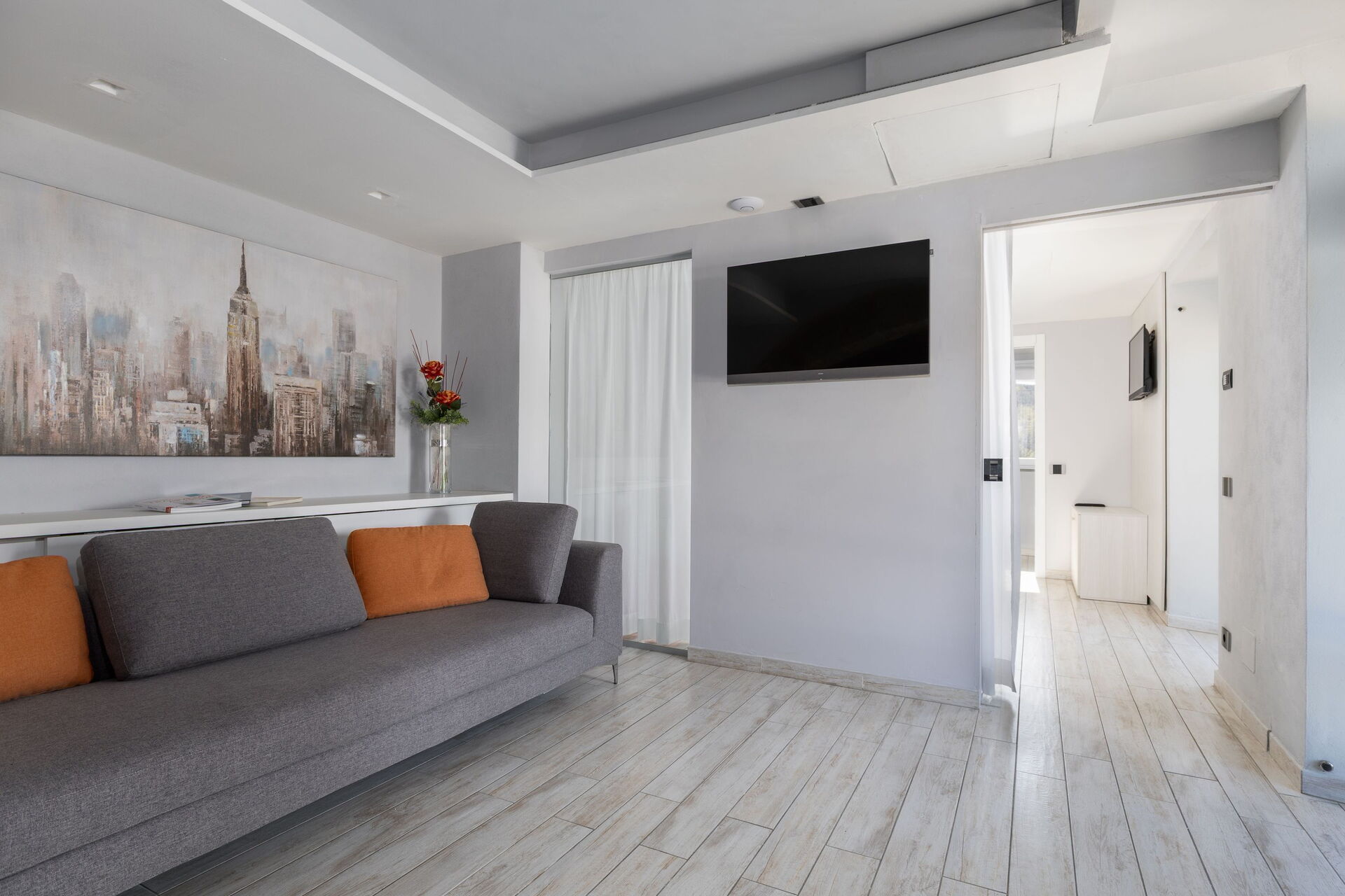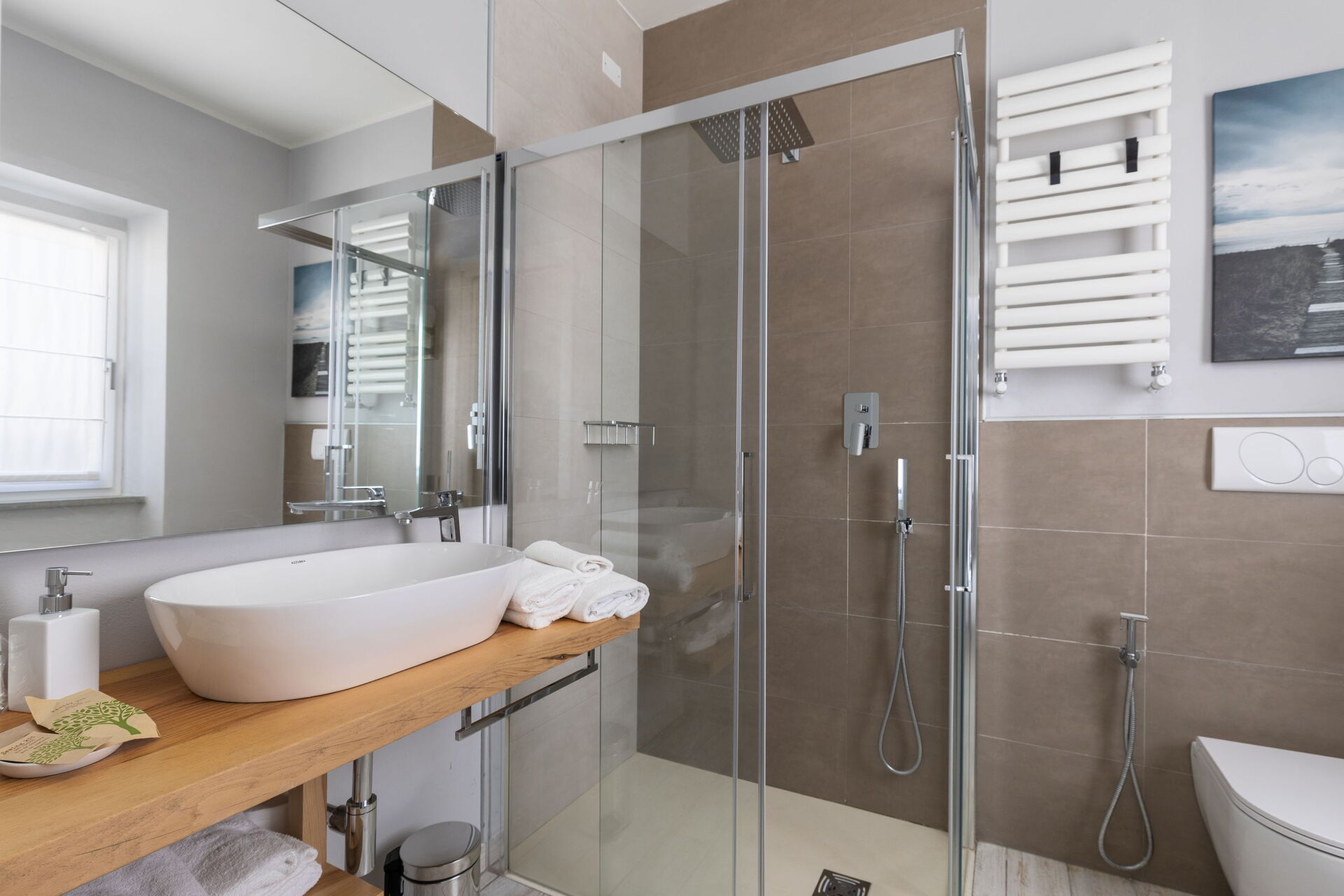 Inträde till vardagsrum med vardagsrum (TV), matsal och kök (ugn, frys, diskmaskin, mikrovågsugn, brödrost, espressomaskin), badrum med dusch, 1 rum med bäddsoffa och eget badrum med dusch.