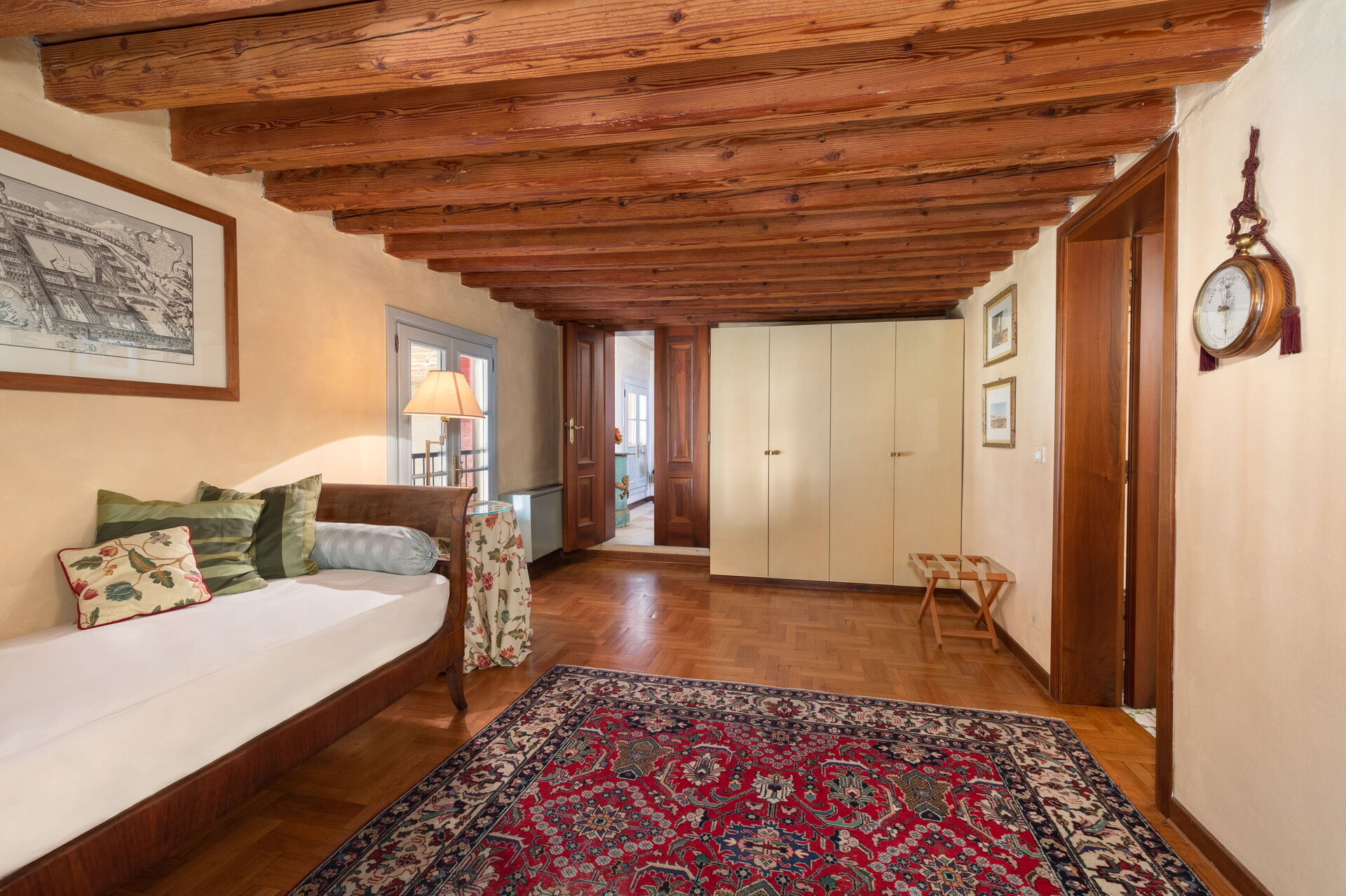 I slutet av korridoren längs en handgjord galleri i trä, 3 dörrar som leder till de andra rummen.