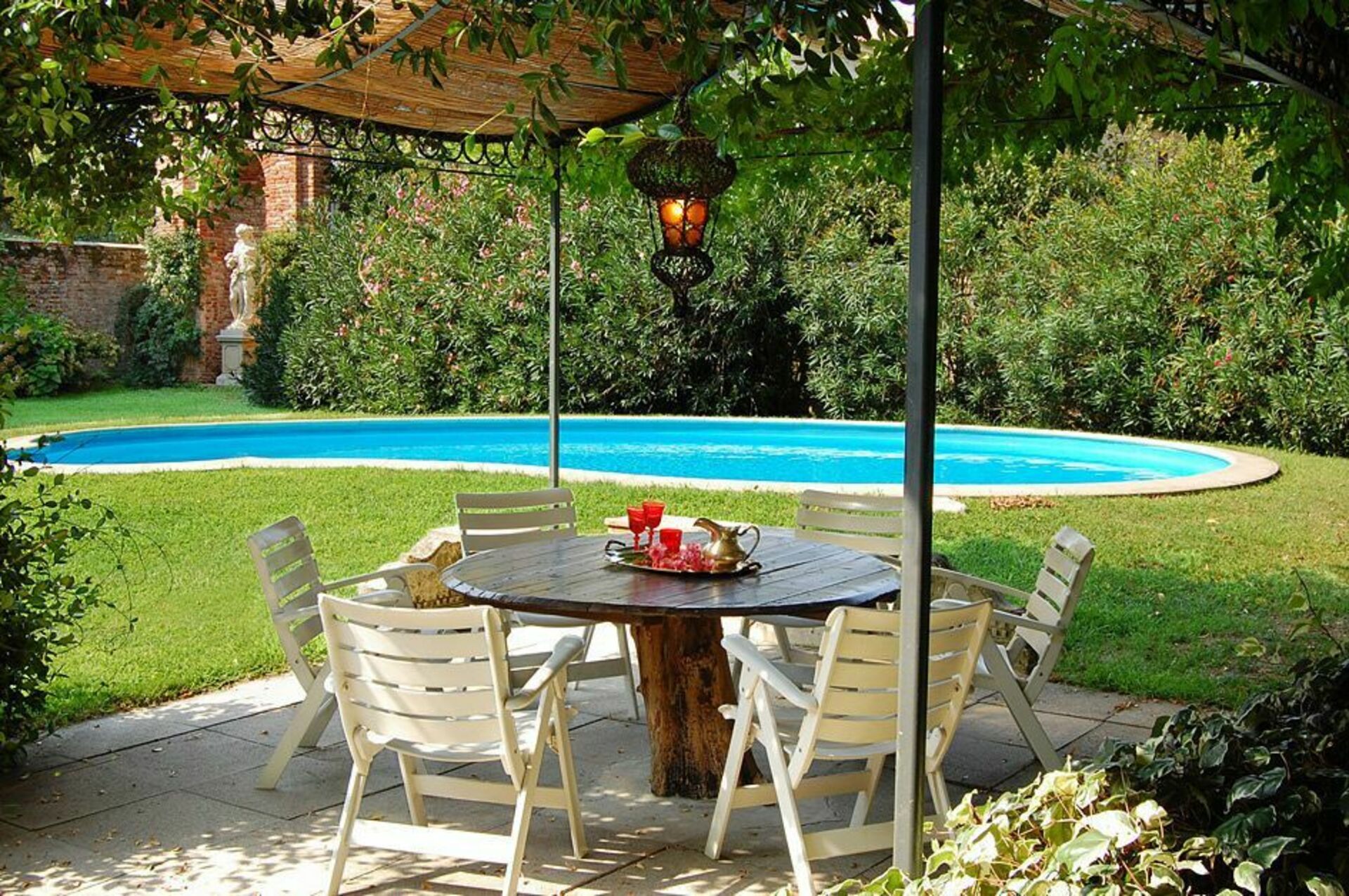 Bortsett från parken, nära till huvudbyggnaden finns en liten privat trädgård separerad från den största parken, med en swimmingpool omgiven av oleander, rosor och hortensior. Trädgården kompletteras med ett lusthus, ett träbord, 10 stolar, 6 solstolar och en grill. Ett omklädningsrum, badlakan , extra stolar och ett litet kylskåp är tillgänglig från den privata trädgården.