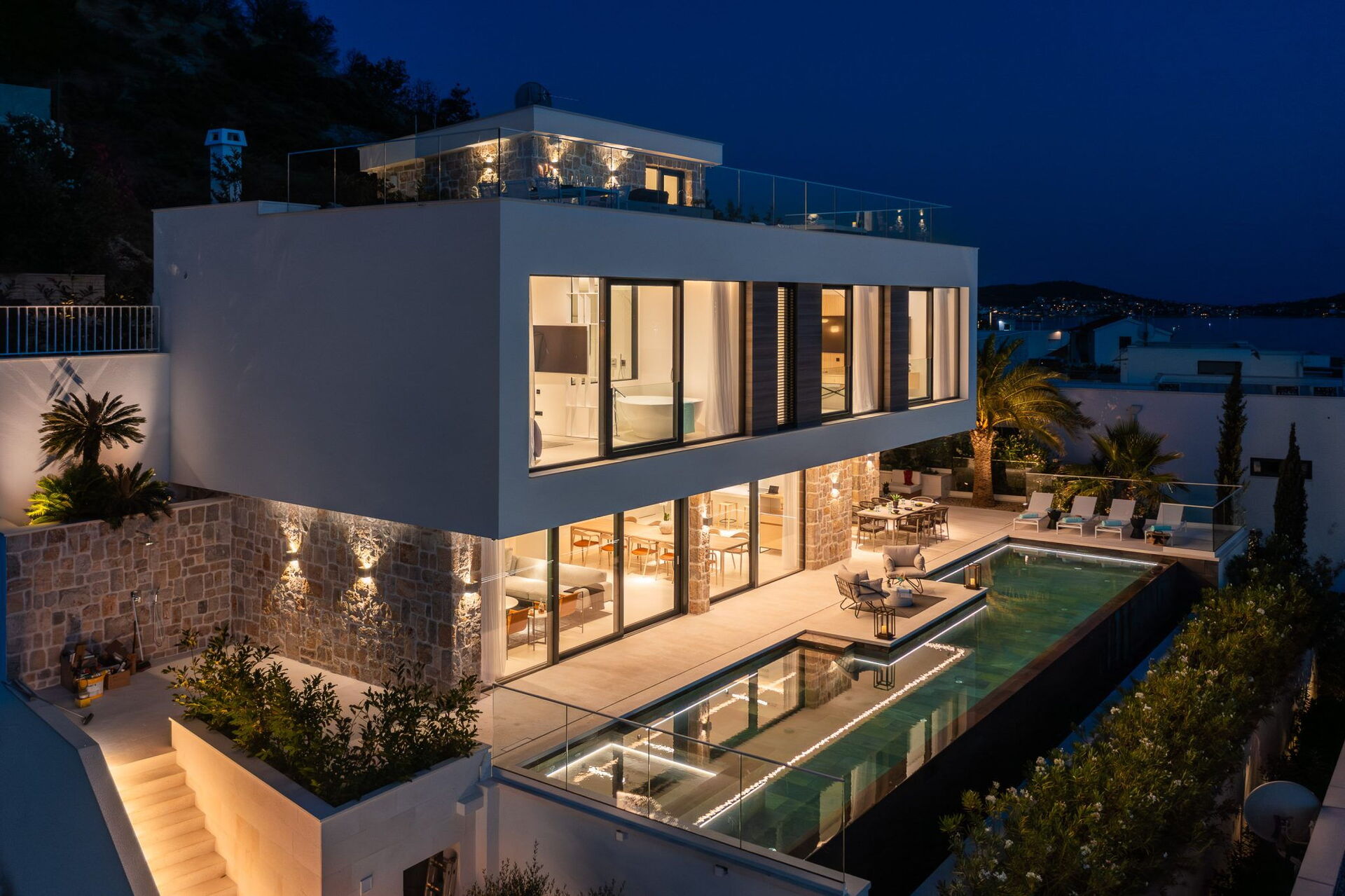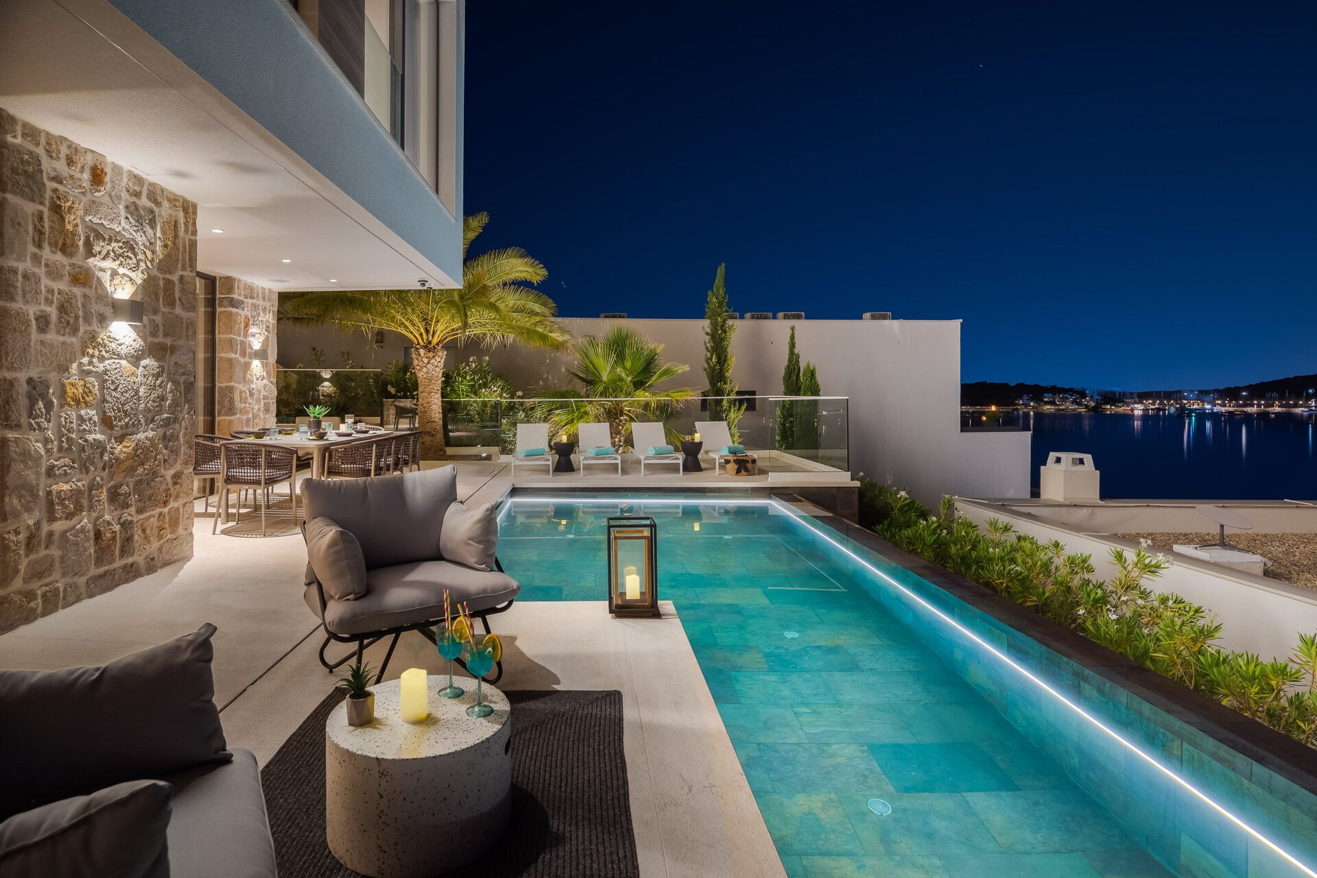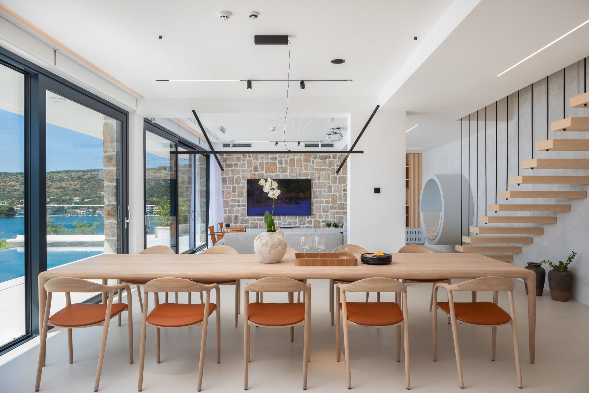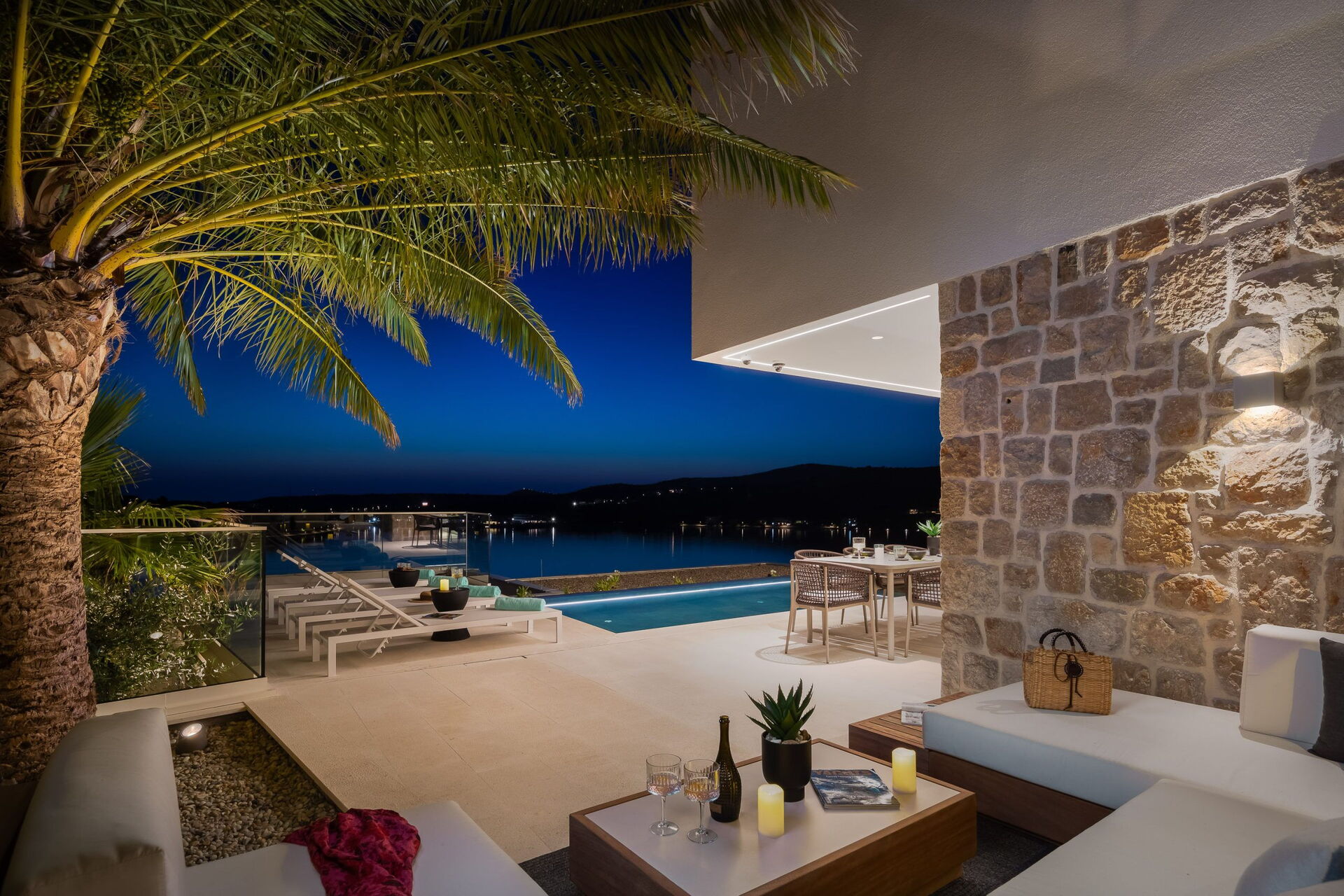 Huset är på två våningar, har fantastisk utsikt och är utrustat med alla moderna bekvämligheter. Med sina 3 sovrum och en ljus, elegant interiör kan semesterhuset bekvämt rymma upp till 6/8 personer. På fastigheten finns många utomhusgemensamma områden med naturskön utsikt där gästerna kan tillbringa tid tillsammans med familj eller vänner. Koppla av och njut av en måltid på takterrassen, som har ett utekök, grill och bubbelpool. Njut av Kroatiens sol vid den uppvärmda infinitypoolen med havsutsikt.