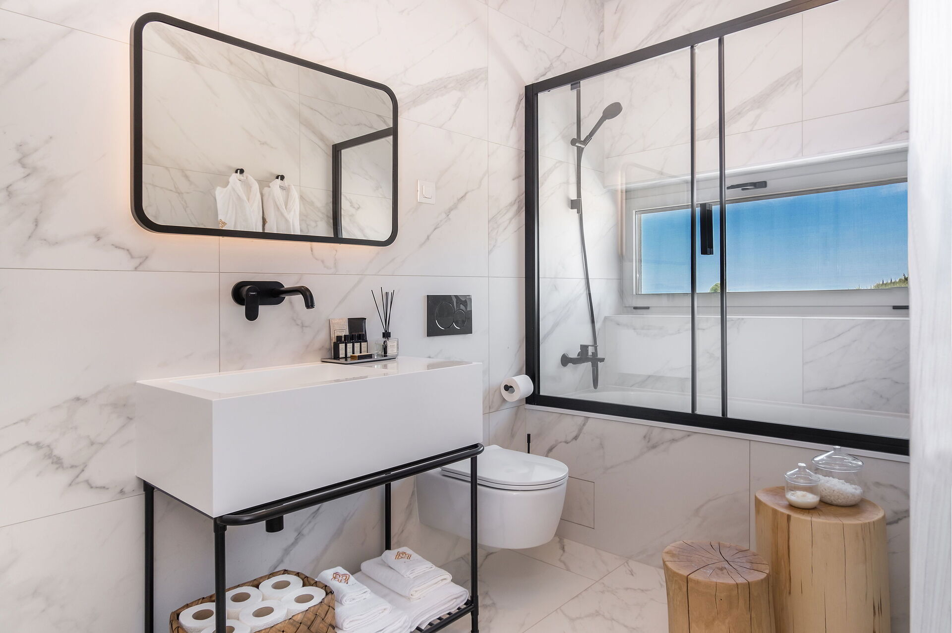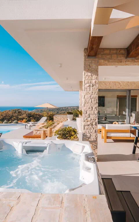 Villa Steropa har en härlig utsikt över havet och den omgivande landsbygden. Poolen och pooldäcket med solstolar är perfekta för att sola och bubbelpoolen utomhus är perfekt för kvällarna.