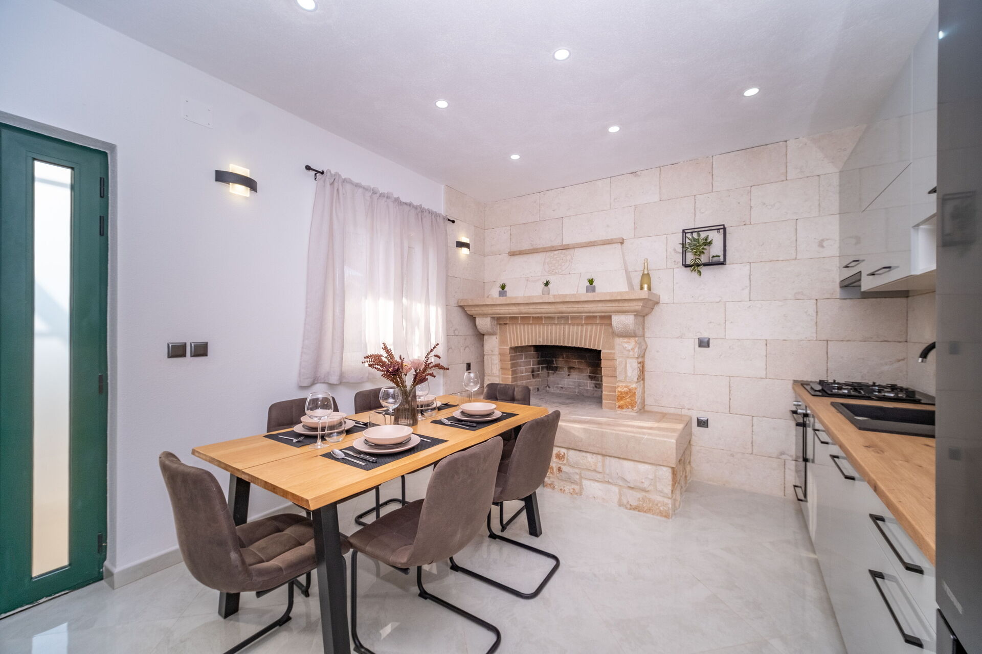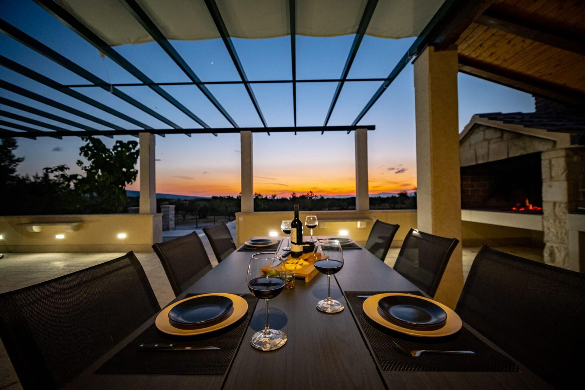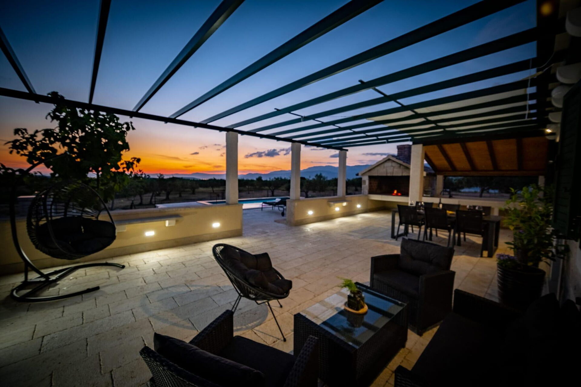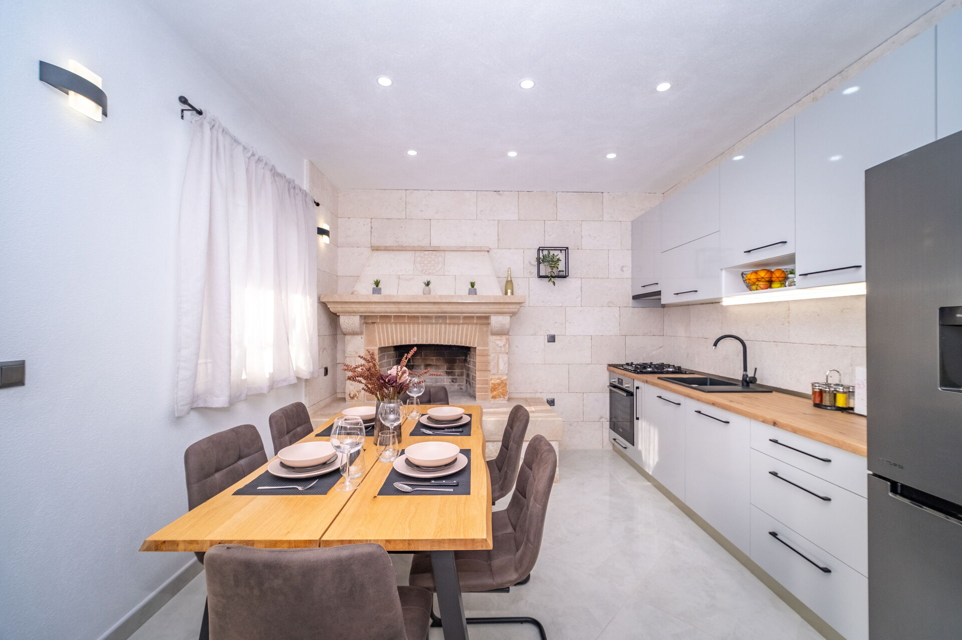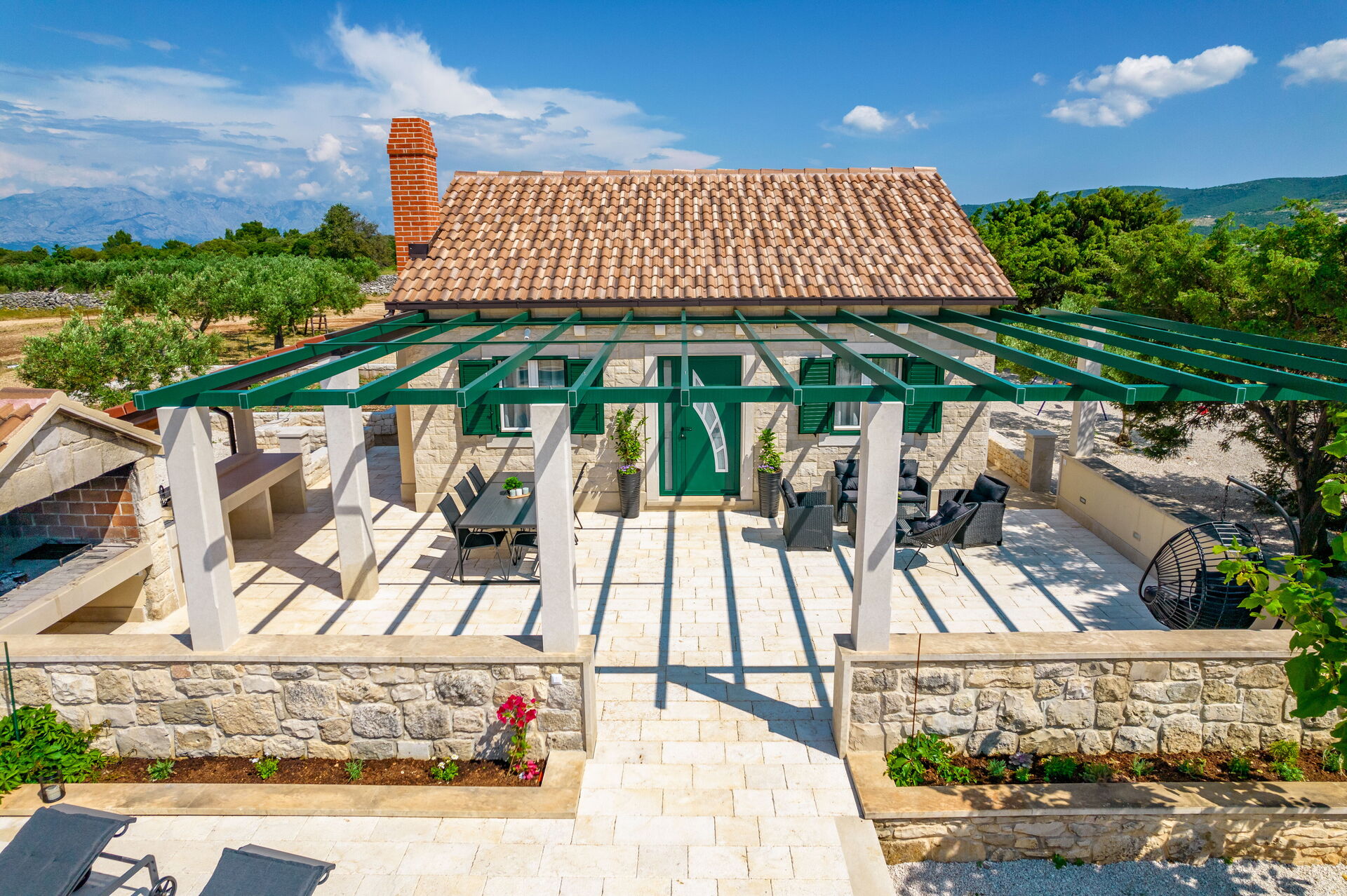 Dalmatisk tradition med stenmurarna smälter vackert samman med omgivningen. Hela trädgården är inhägnad, vilket gör det perfekt för dina fyrbenta vänner att njuta av utrymmet, och det finns även en lekplats för barn.