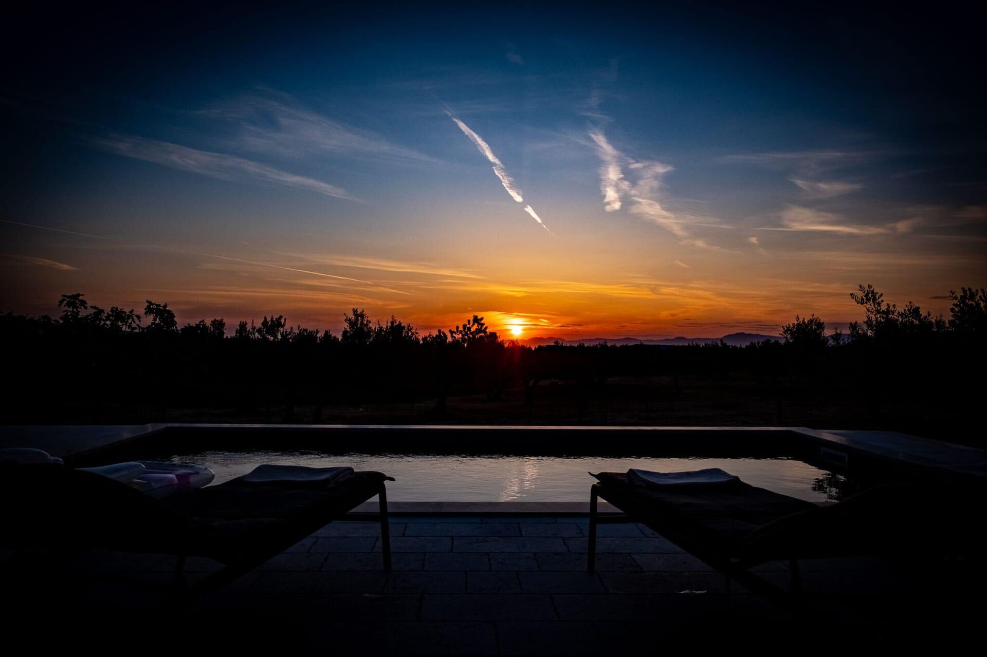 En del av trädgården är belagd med sten och har en rymlig pergola med matplats och utomhuskök med grill. I änden av området finns den vackra privata poolen, den perfekta platsen att njuta av solnedgången med havsutsikt.