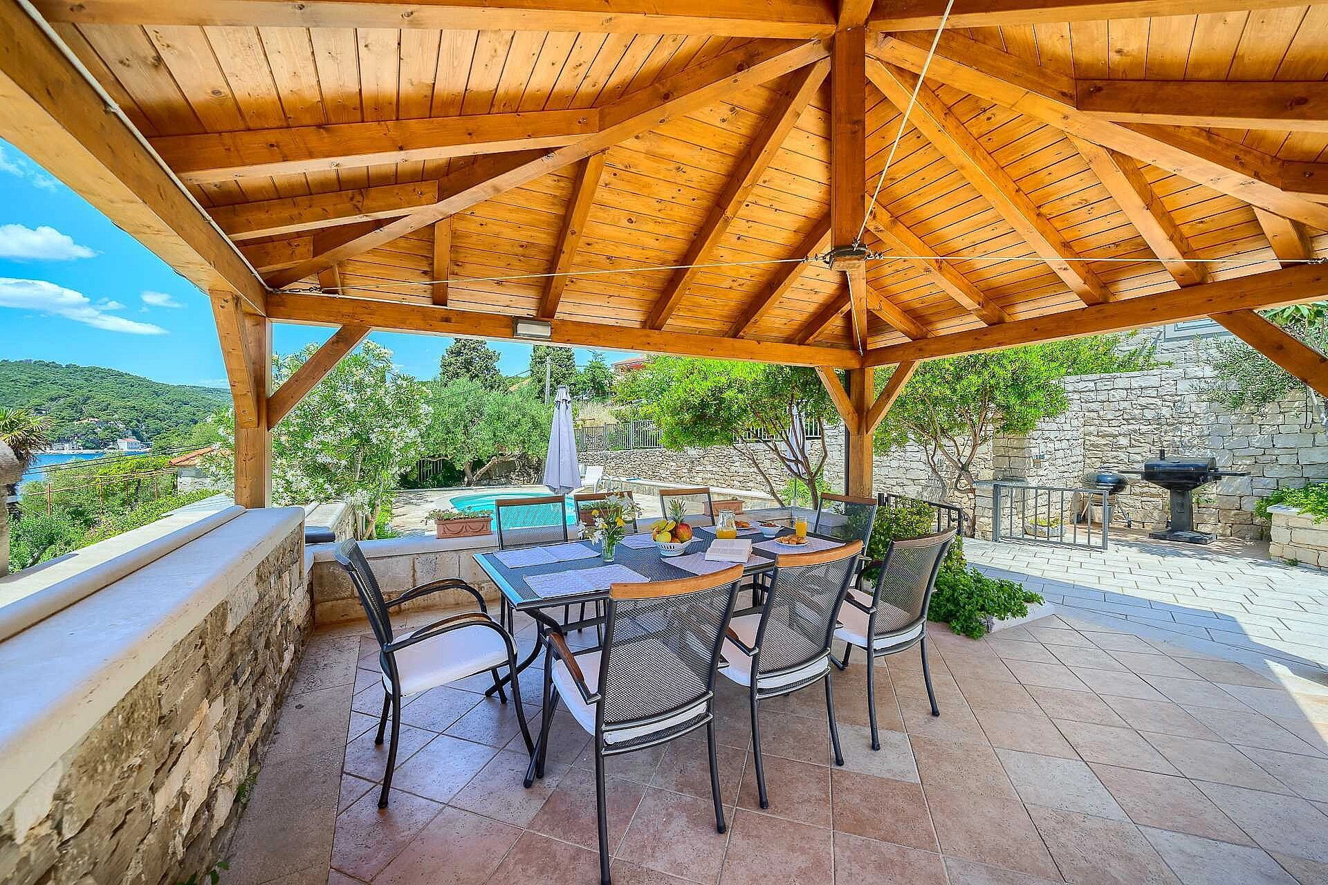 På utomhusområdet kan du njuta av havsutsikten från den vackra terrassen i Villa Mir Vami. Den privata poolen med parasoller och solstolar är ett utmärkt ställe att tillbringa varma sommardagar med familj eller vänner. Annars kan du använda den närliggande stranden, bara 250 meter från huset. Det finns också en utomhus lounge, grill och pergola-täckt matplats, möblerad med bord och stolar för att njuta av måltiderna utomhus, med den vackra utsikten och havsbrisen.