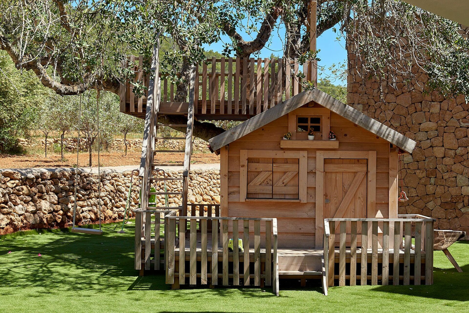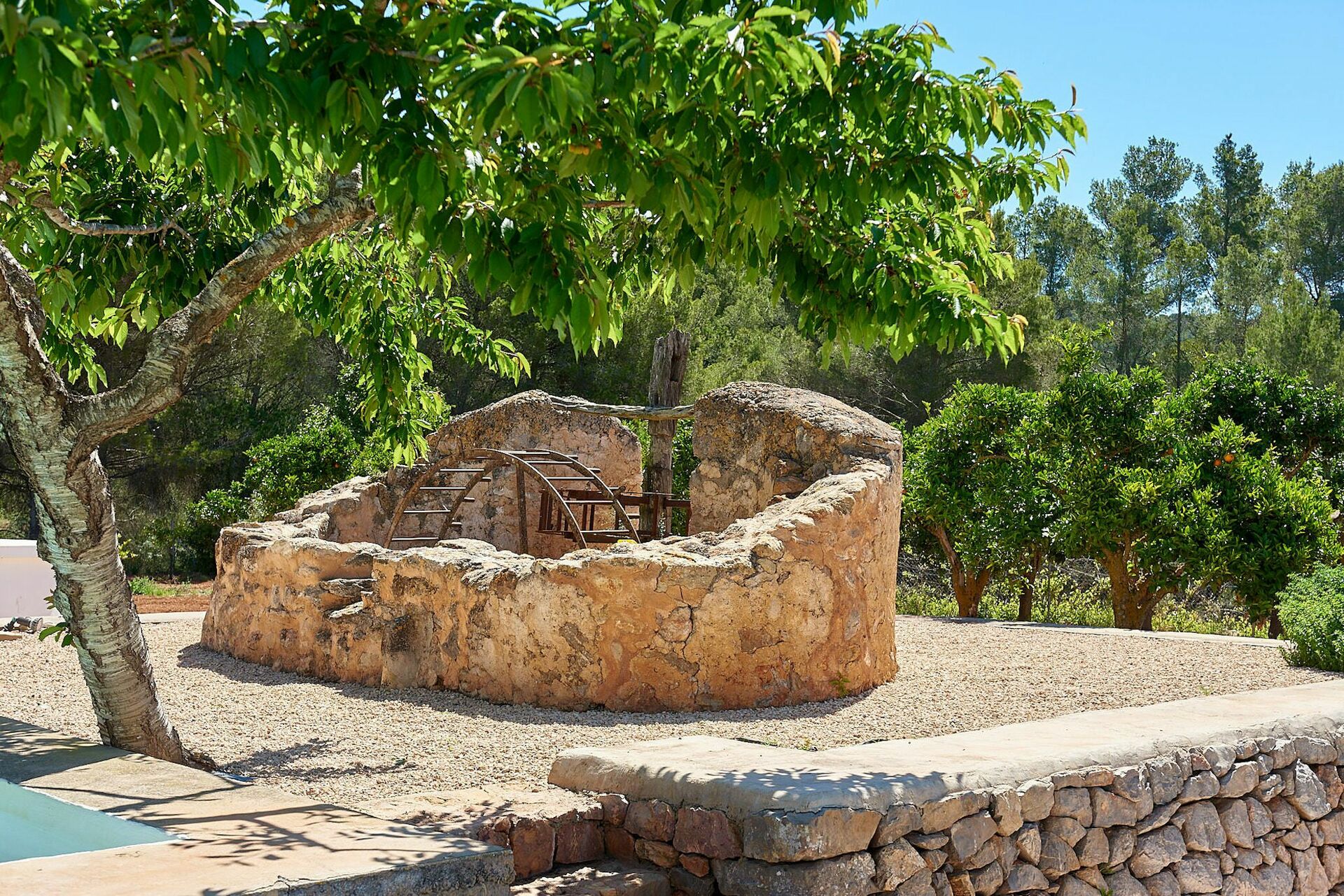 Huset är omgivet av orörd natur och har en stor välskött trädgård med solterrass vid poolen som är utrustad med solstolar och parasoller. Här är det perfekt att svalka eller koppla av på varma sommardagar. Gästerna kan använda sig av de många möblerade utomhusutrymmena med bord, stolar, soffor och fåtöljer. Dessutom finns det ett utrymme för uteservering.