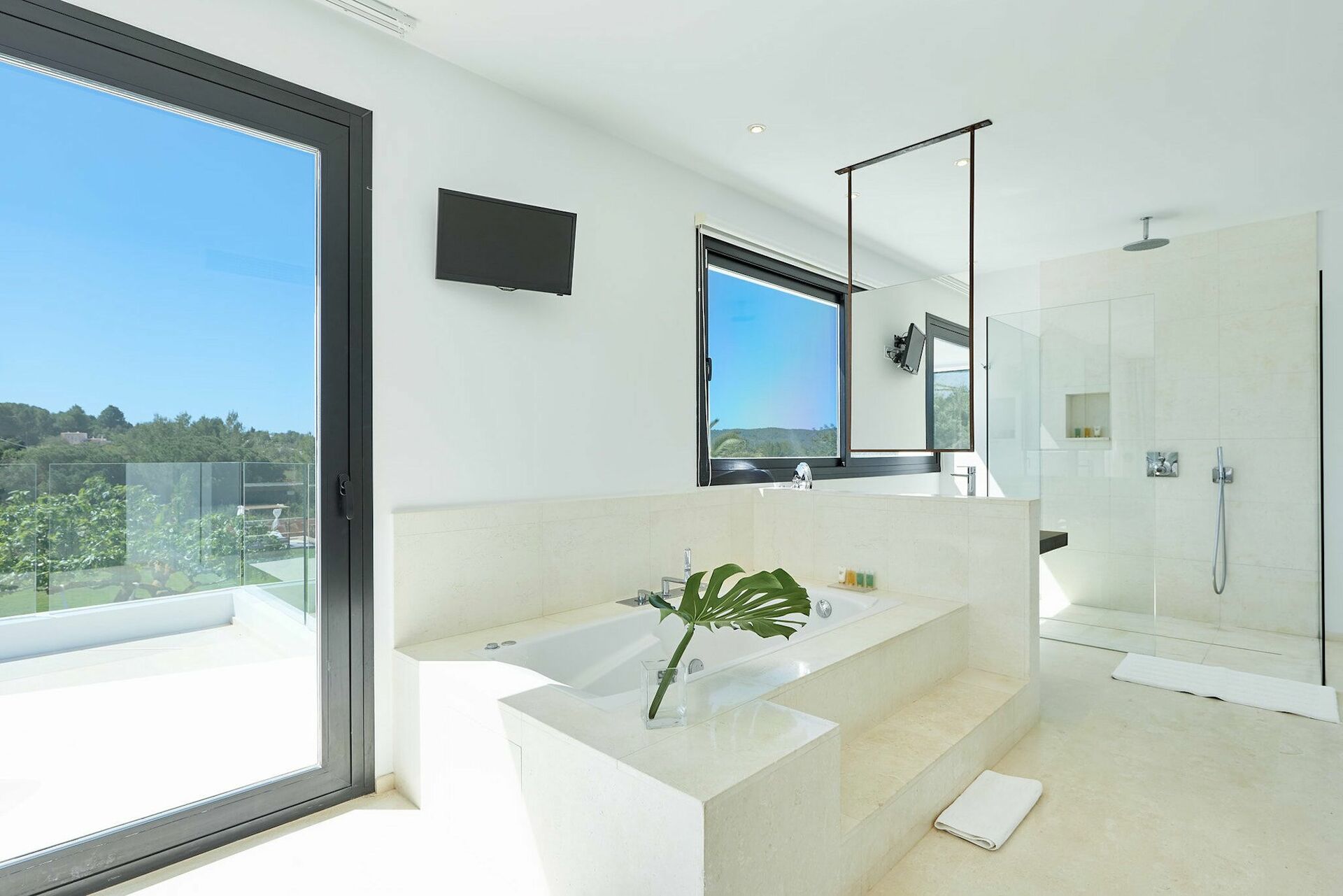 Bottenvåning: vardagsrum, matplats, fullt utrustat kök. Två dubbelrum med delat badrum; 2 sovrum (ett med dubbelsäng, ett med 2 enkelsängar), vardera med eget badrum med dusch och jacuzzi utomhus